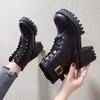 Autumn single boots, laced black Martin boots, round toe, chunky heel, high heel, belt buckle, women's short boots