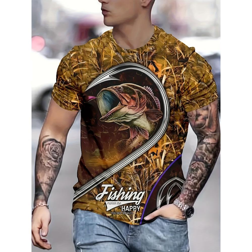 Men'S Casual Short Sleeve T-Shirt,3D Fishing Hook & Fish Print,Breathable Quick-Dry Polyester,Crew Neck,Slight Stretch