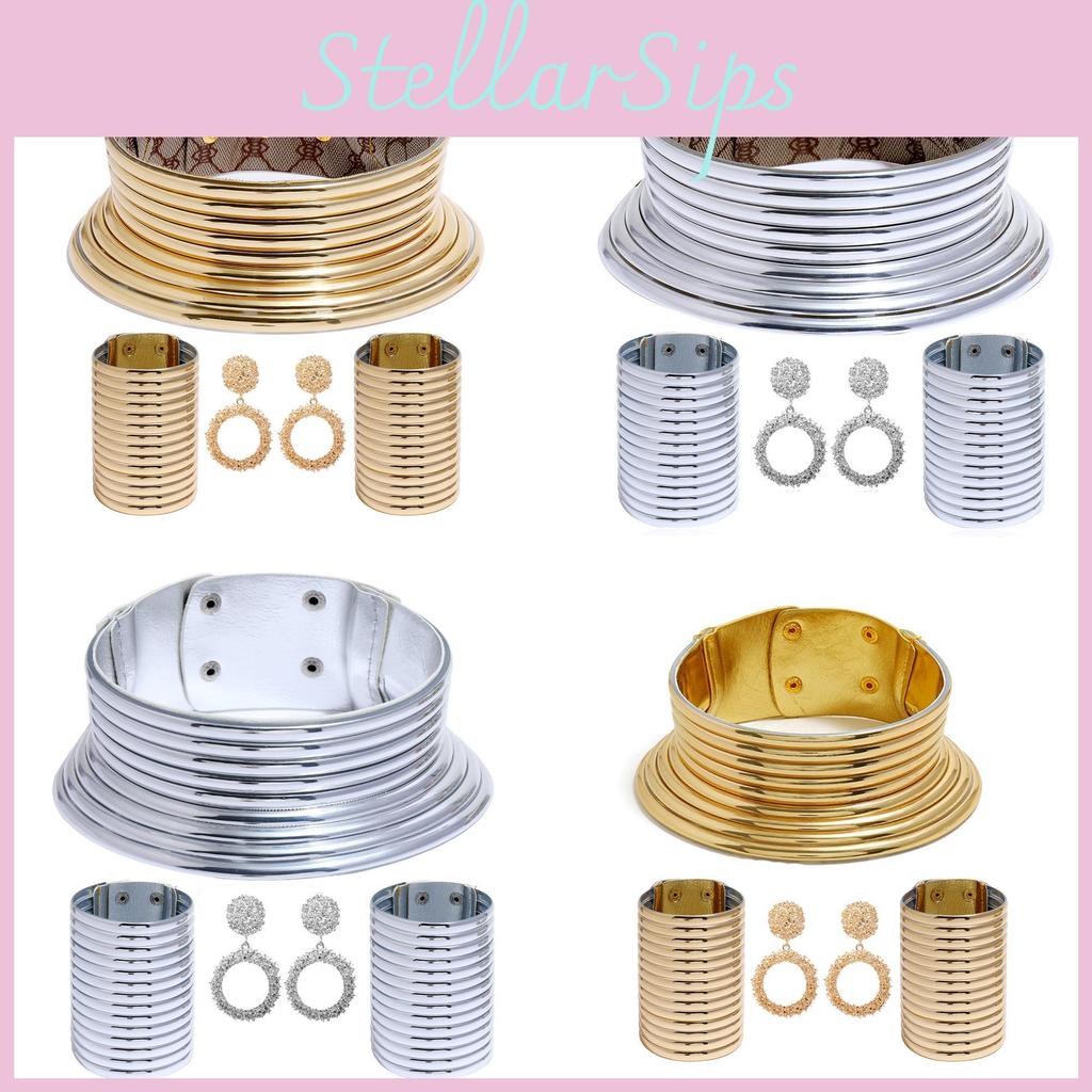 This African-inspired metallic necklace set crafted from durable plastic and resin.with a secure snap clasp for easy wear. The set includes vibrant color options such as gold, silver, and fabric-patterned finishes, perfect for adding a vintage touch to any outfit. Ideal for casual or artistic fashion ensembles, these versatile accessories are suited for summer events or cultural-inspired styling. Wipe clean with a damp cloth to maintain their finish.