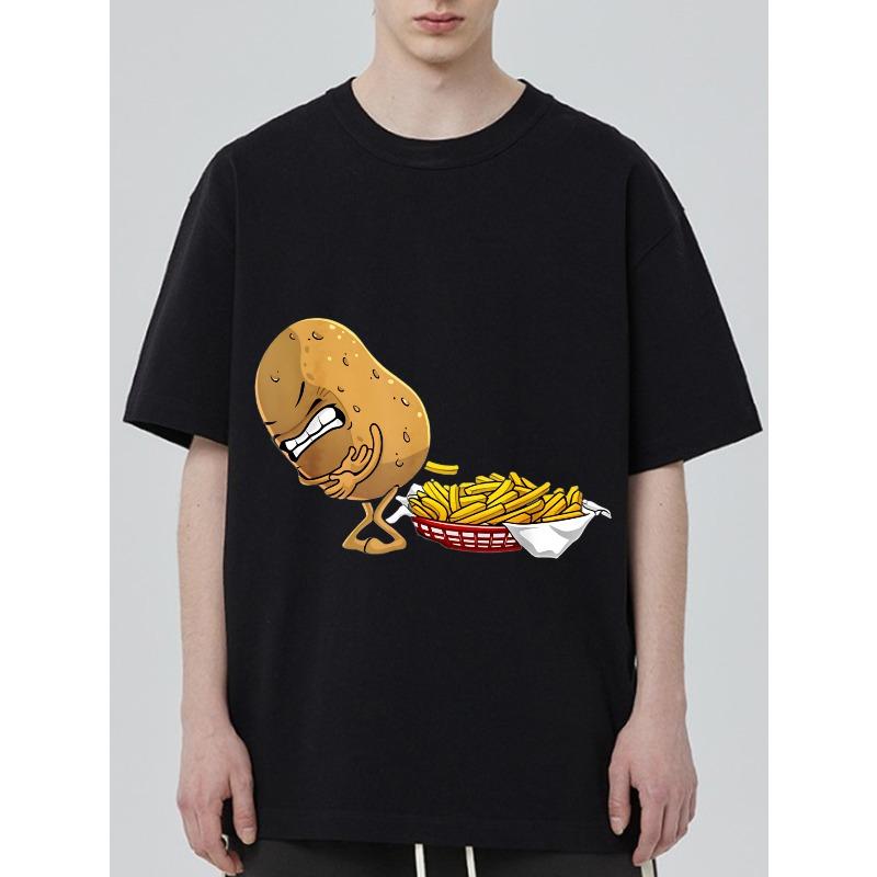 Oversized T-Shirt Black Potato Cartoon French Fries Print Casual Streetwear Summer Top Men Women Unisex Fashion Trendy Graphic Tee