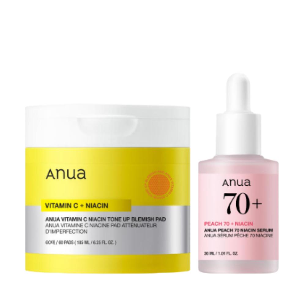 Anua Vitamin C Niacin Tone-Up Pads & Peach 70 Niacin Serum Set – Brightening 2-Step Routine