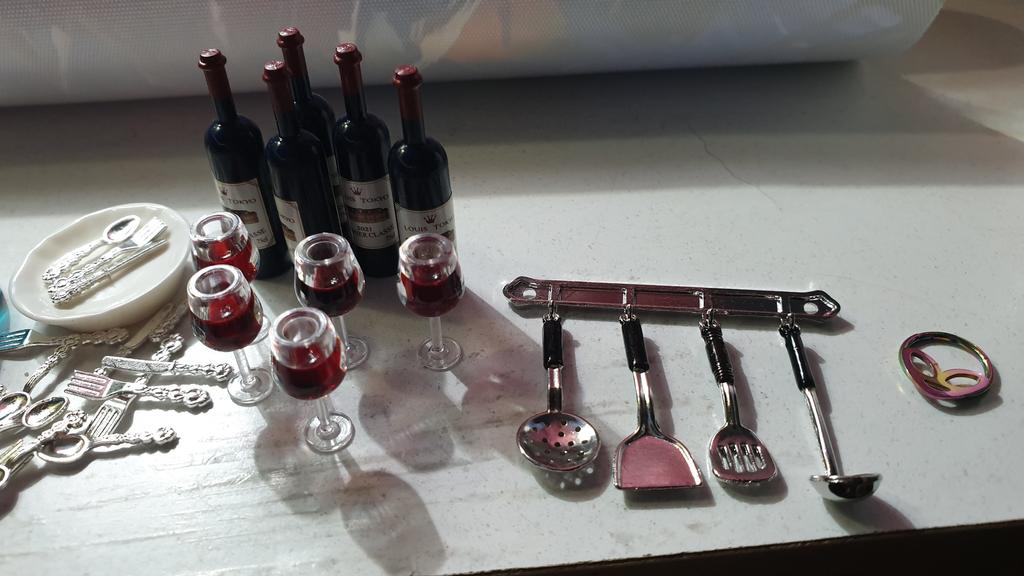 Die Stange wird mit den vier Kellen geliefert, um sie aufhängen zu können. Sie sind ideal für eine Puppenhausküche, sie hat die perfekte Größe für diese Sammlung. Sie sind aus Kunststoff und in zwei Farbtönen erhältlich, ich habe mich für die bronzefarbenen entschieden und sie ähneln perfekt den echten.. Die mitgelieferten Löffel sind die, die wir normalerweise in jeder Küche haben. Es dauerte drei Wochen, um in Spanien anzukommen.