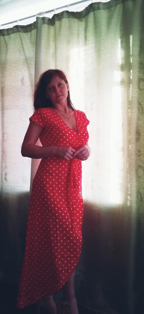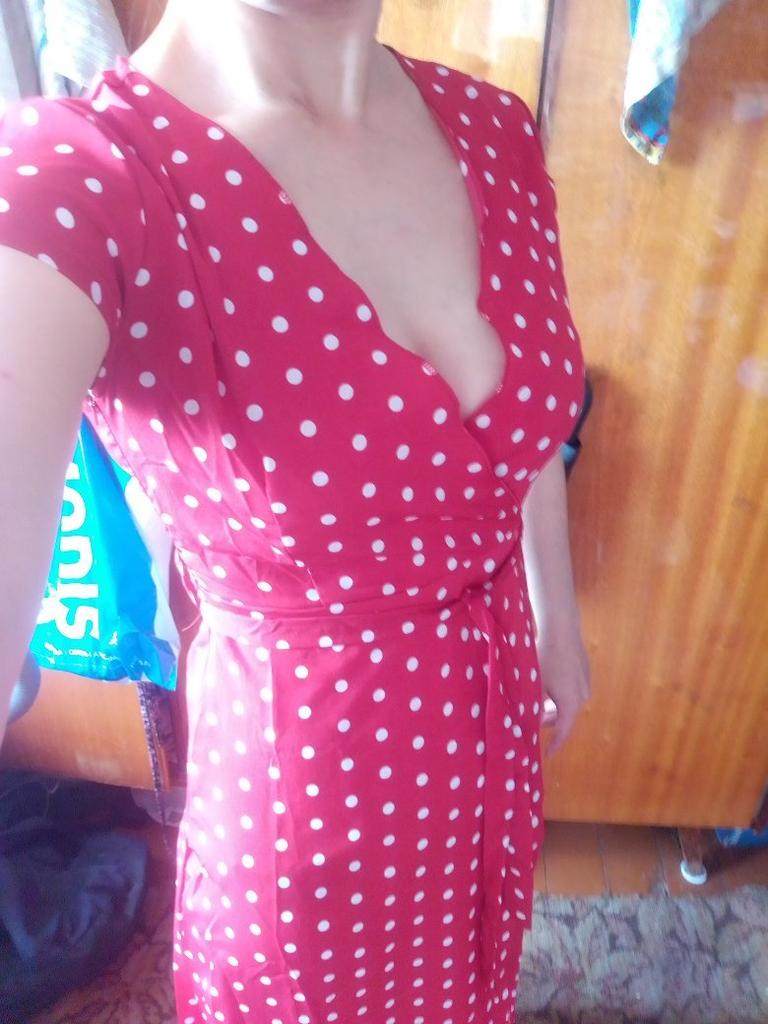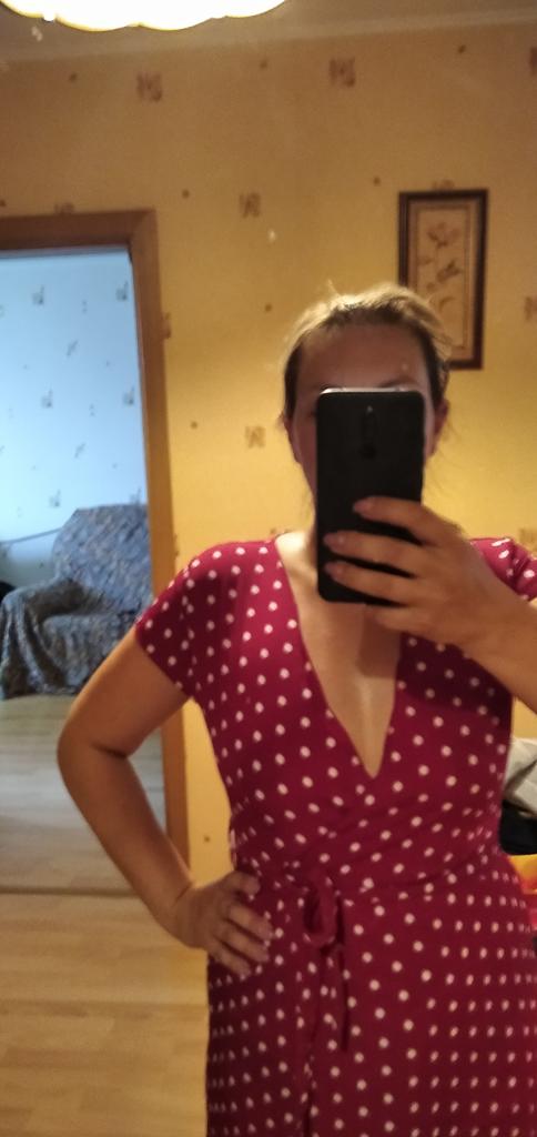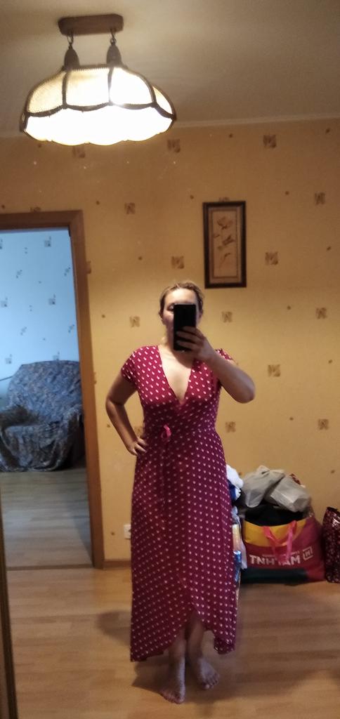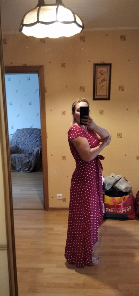 The fabric quality is thin, not like in the photo, the neckline is very large, return. The dress does not match the photo, it has a wrap front, which is not visible in the photo.