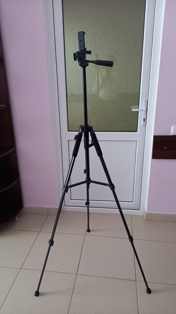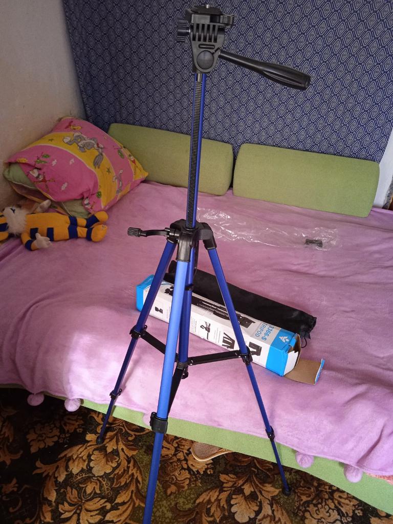 Exactly what I needed and what is shown in the description. This is a tall tripod that can be used both for and for a camera. It looks good quality, but I haven't used it enough yet to be sure of its quality. One small complaint is the fact that the box when it arrived was battered and disintegrated.