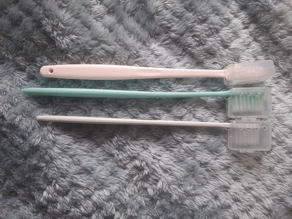A set of toothbrushes, small and sturdy, each has a case for the bristles, for traveling, for both adults and children, a great find! 😁👍