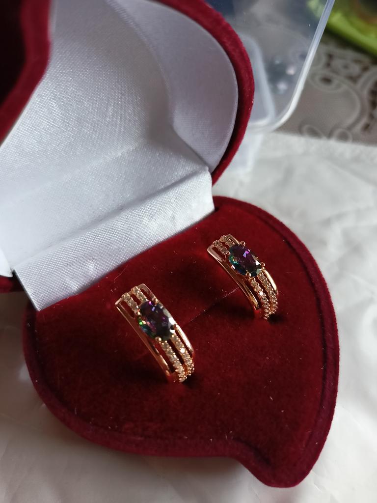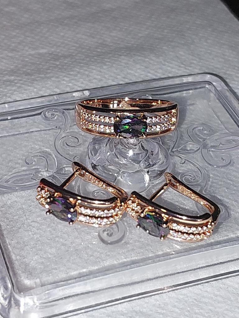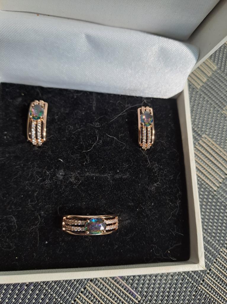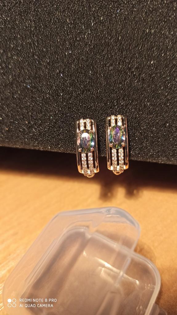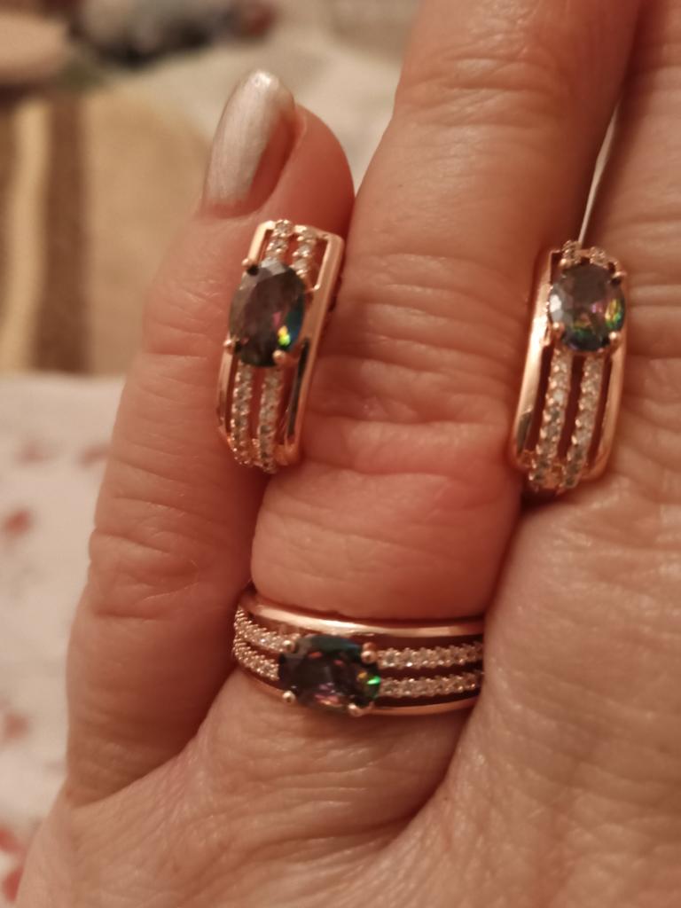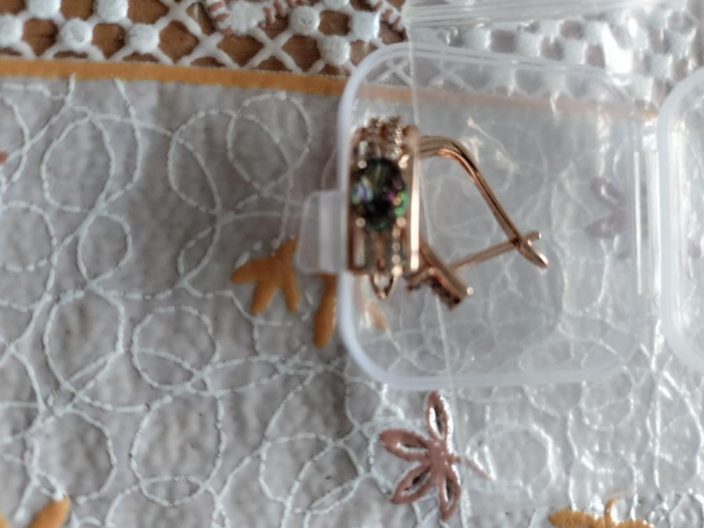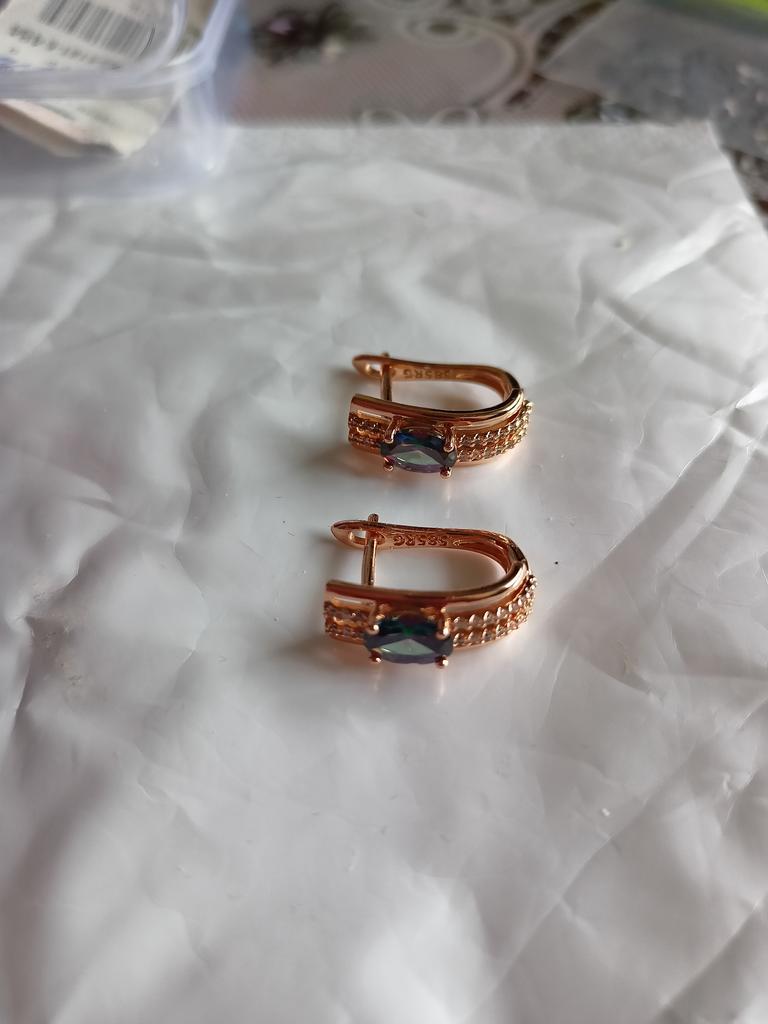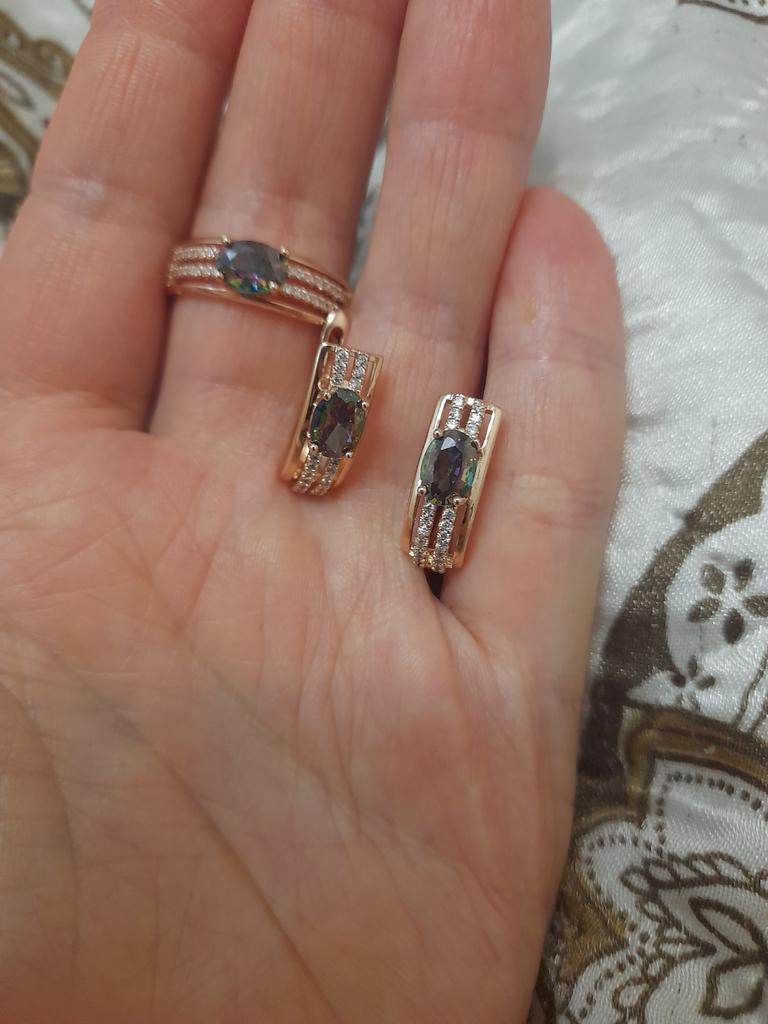 The earrings are beautiful, neatly made, but they look massive. A little too big for me, the holder that is inserted into the ear, you need to have a transparent kapron pusette to pull the earring up to the ear, because it turns around with the central stone to the bottom. The central stone is iridescent from pale green to the pink color, I like it. I ordered a 7 size ring for the earrings, but it came in a 10. Thank you to the seller, everything is neatly packed and folded in a nylon box.