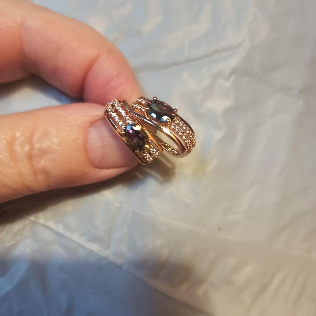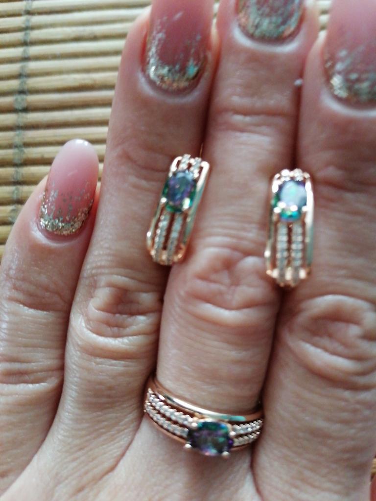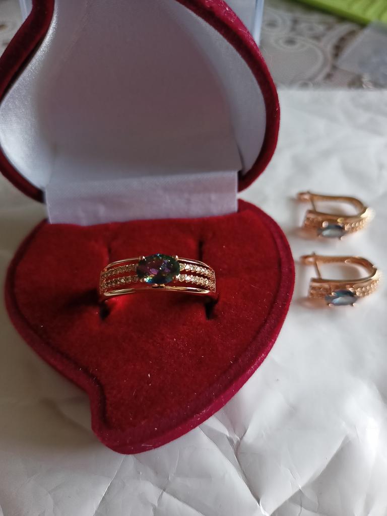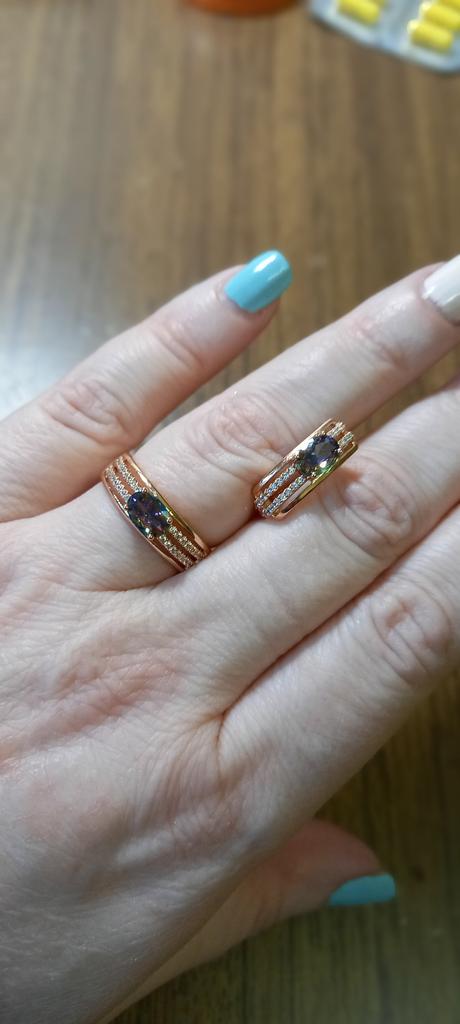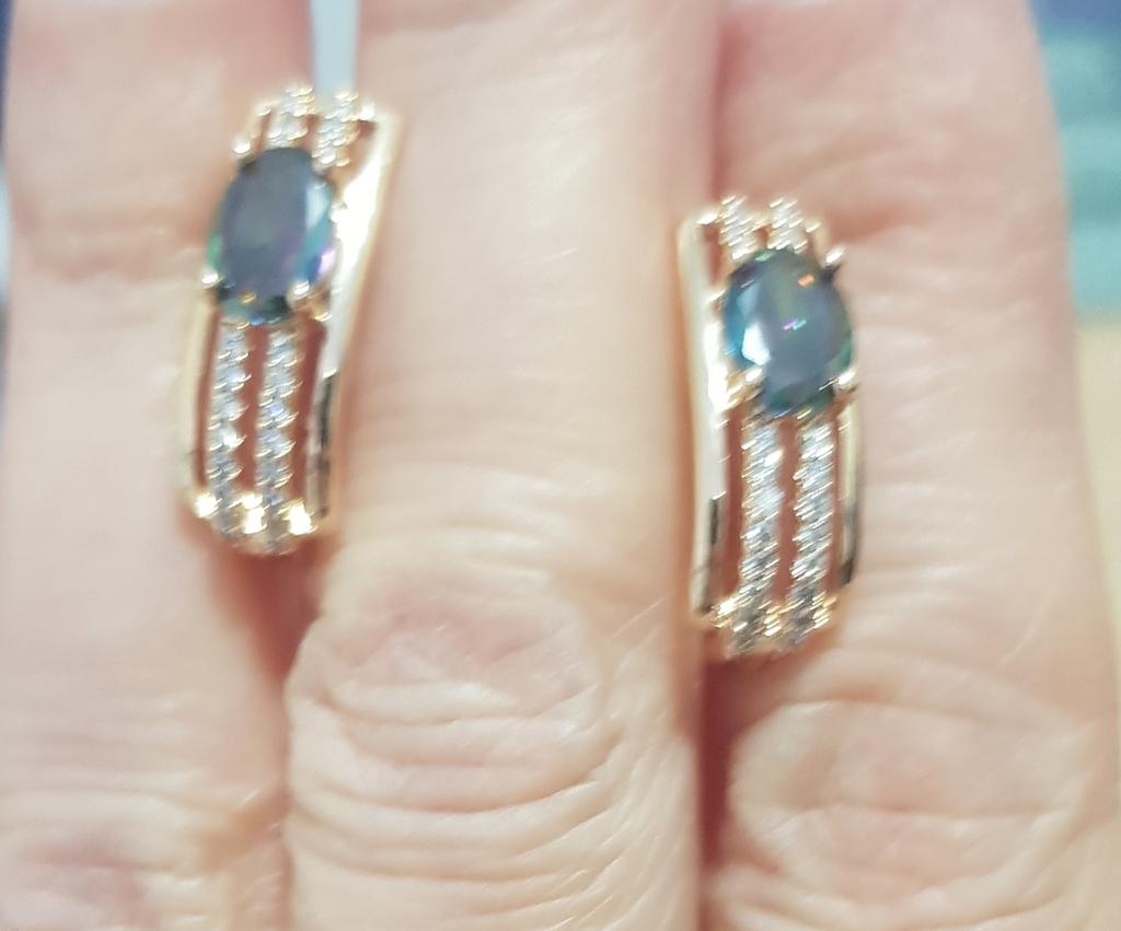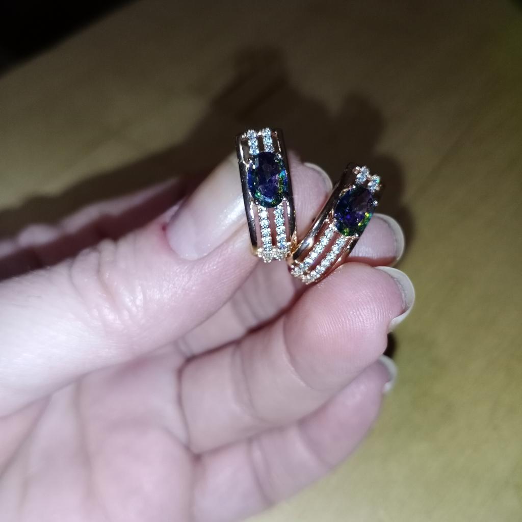 The earrings are beautiful, neatly made, but they look massive. A little too big for me, the holder that is inserted into the ear, you need to have a transparent kapron pusette to pull the earring up to the ear, because it turns around with the central stone to the bottom. The central stone is iridescent from pale green to the pink color, I like it. I ordered a 7 size ring for the earrings, but it came in a 10. Thank you to the seller, everything is neatly packed and folded in a nylon box.