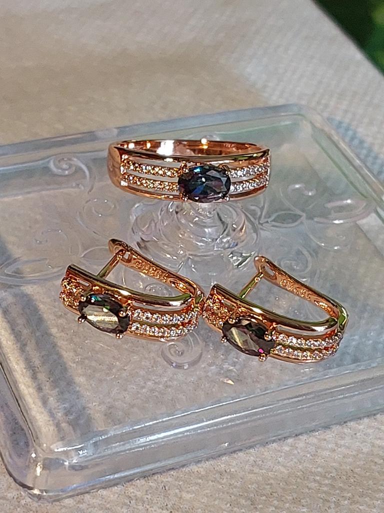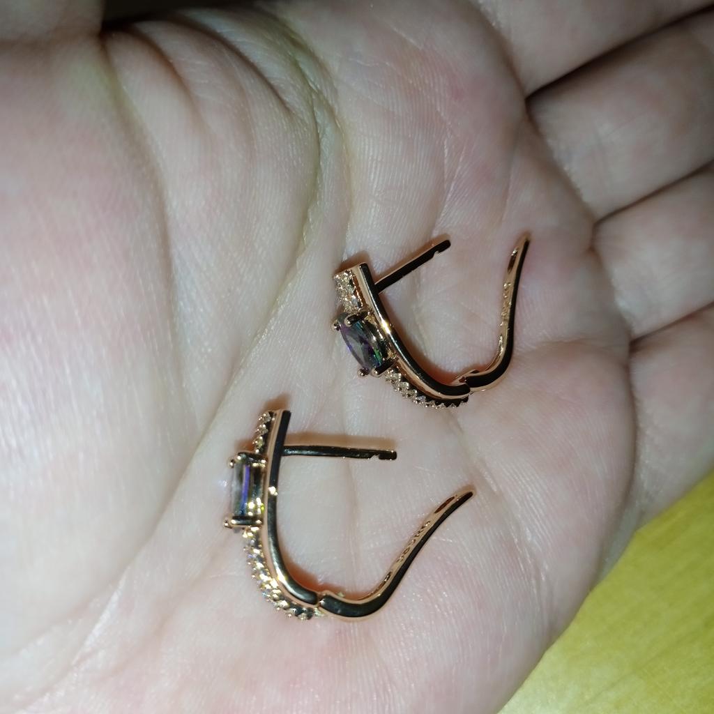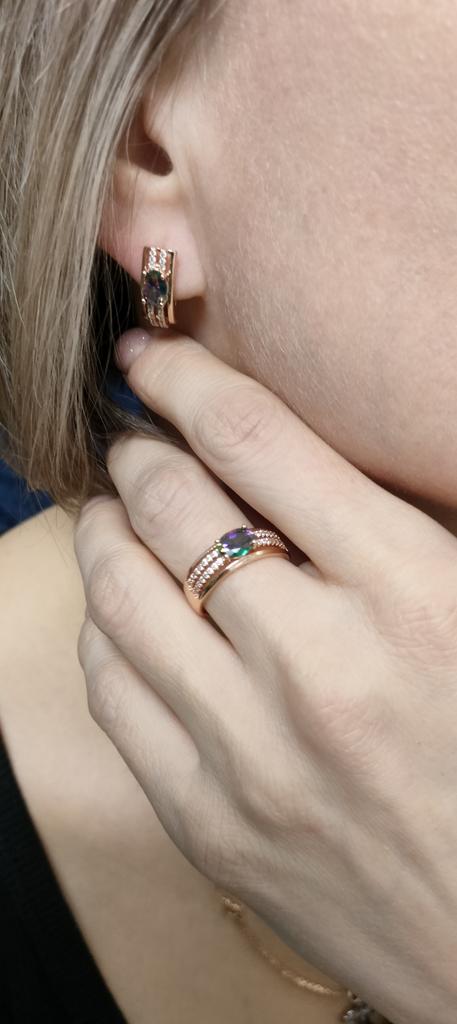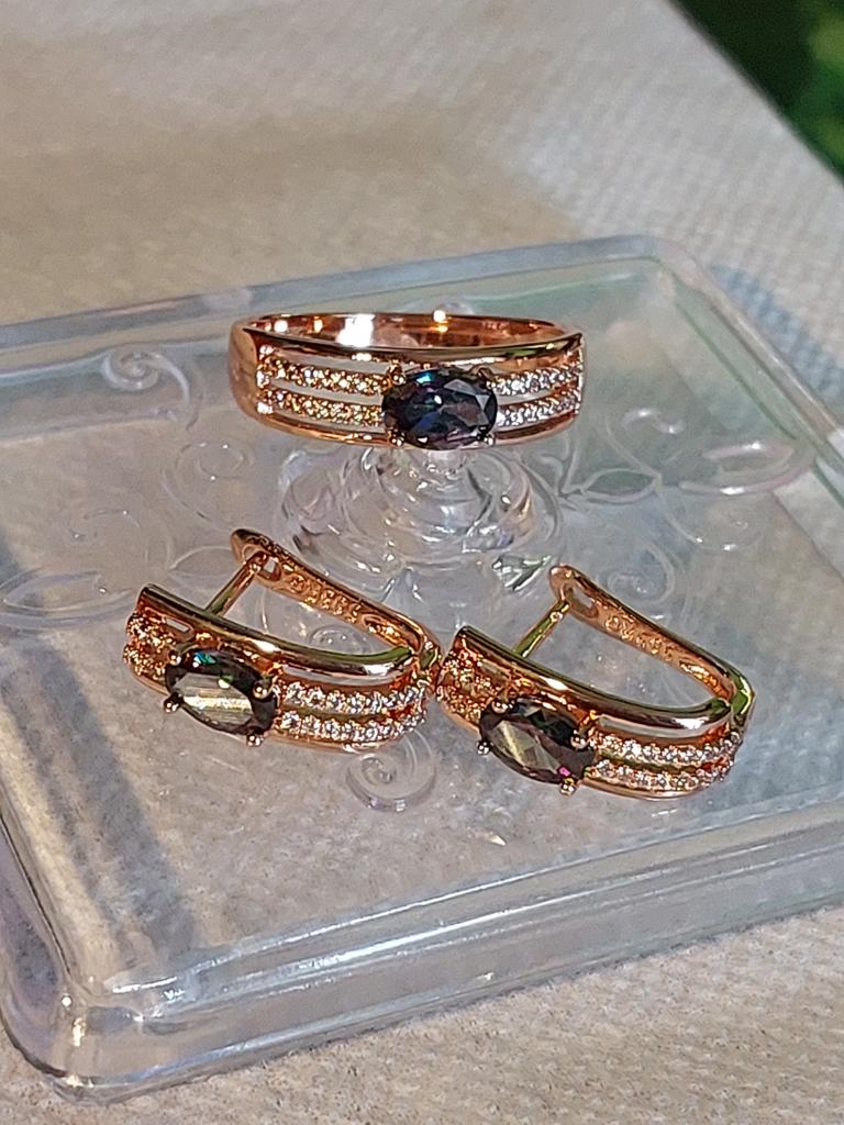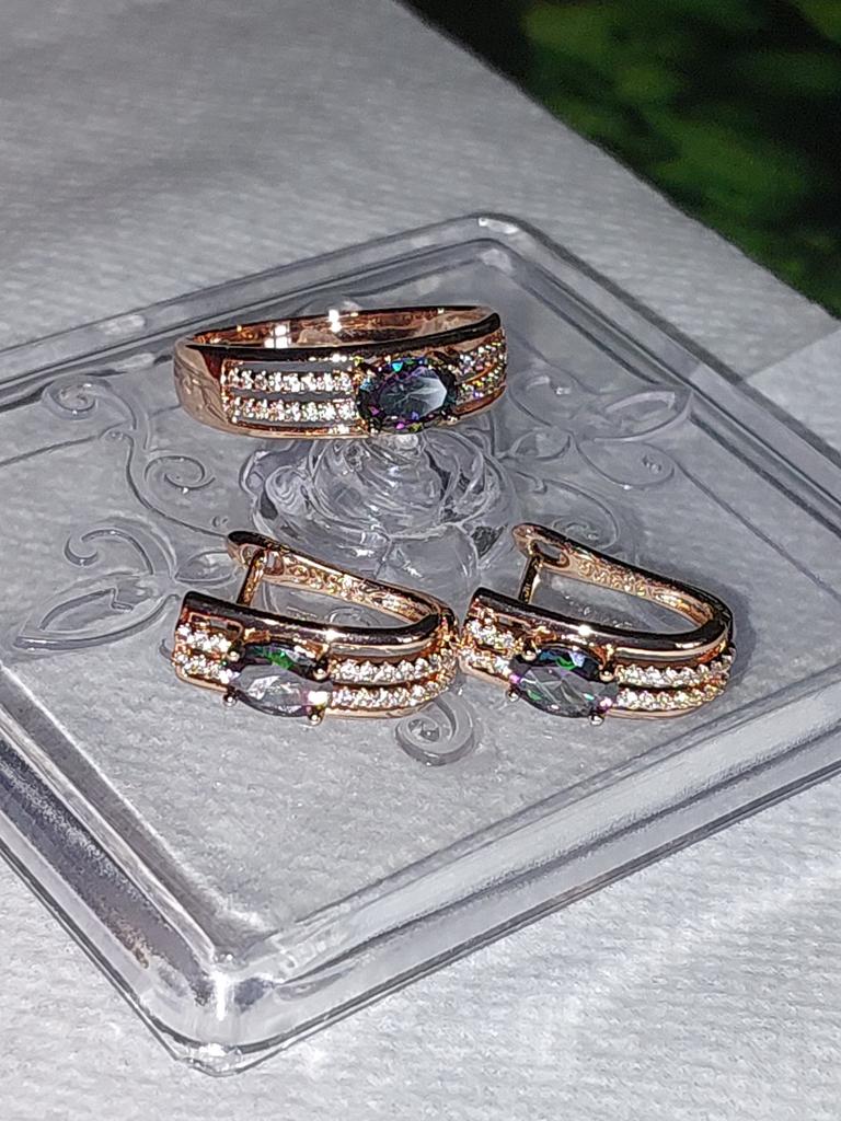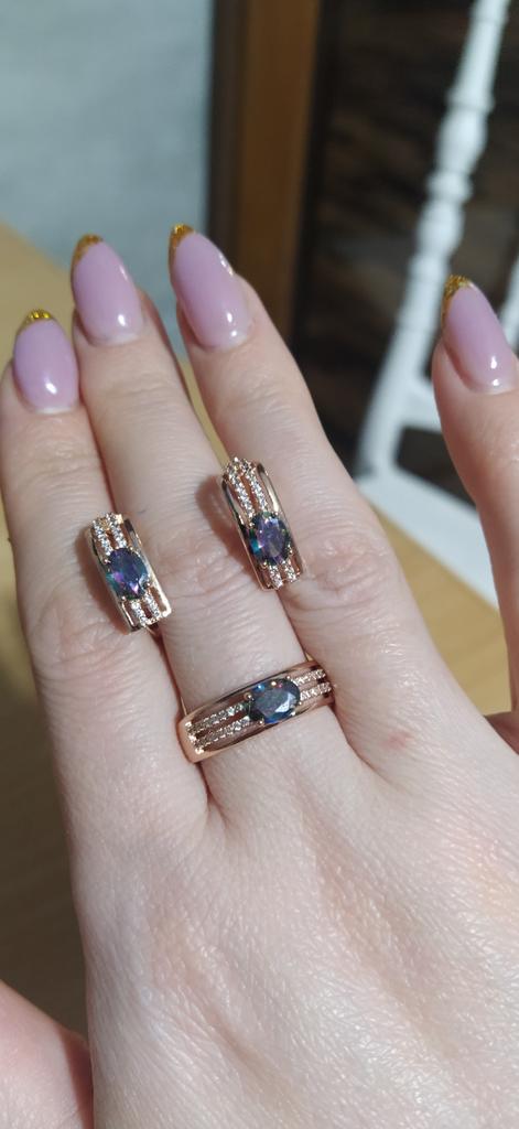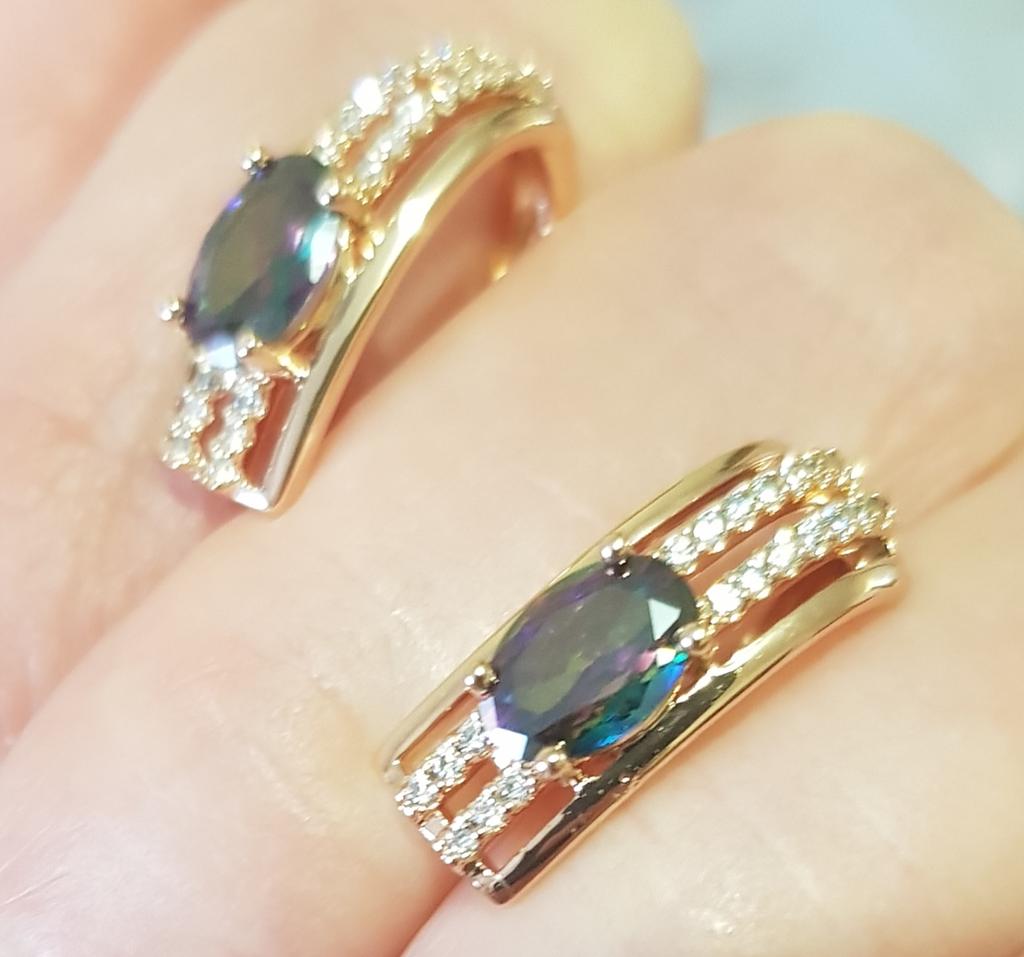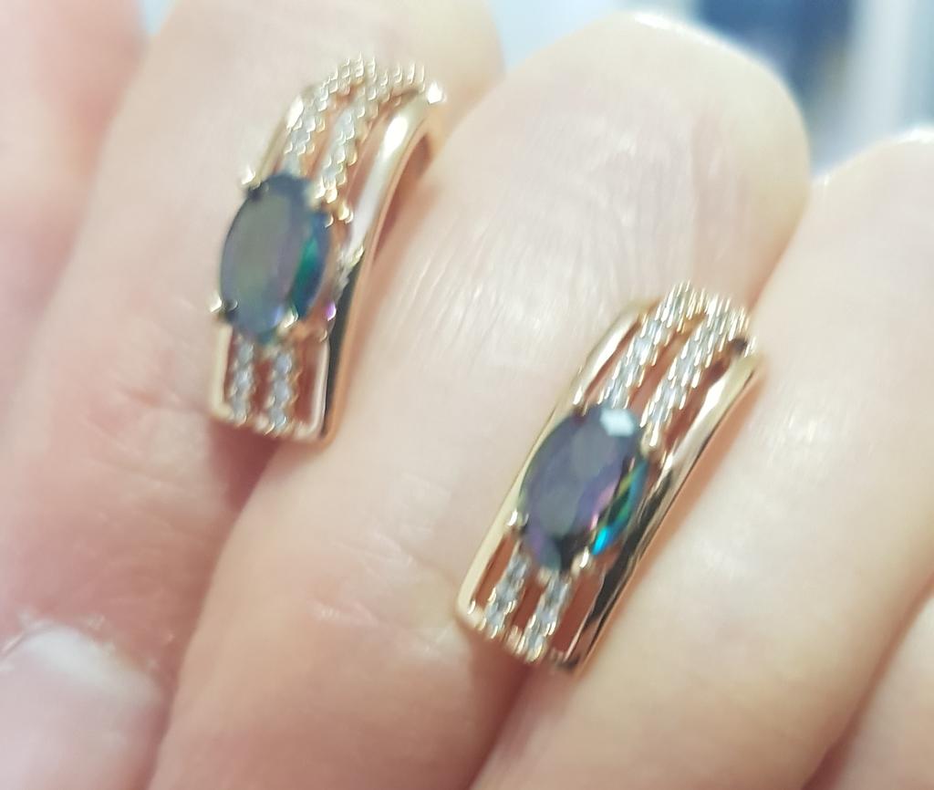 The earrings are beautiful, neatly made, but they look massive. A little too big for me, the holder that is inserted into the ear, you need to have a transparent kapron pusette to pull the earring up to the ear, because it turns around with the central stone to the bottom. The central stone is iridescent from pale green to the pink color, I like it. I ordered a 7 size ring for the earrings, but it came in a 10. Thank you to the seller, everything is neatly packed and folded in a nylon box.