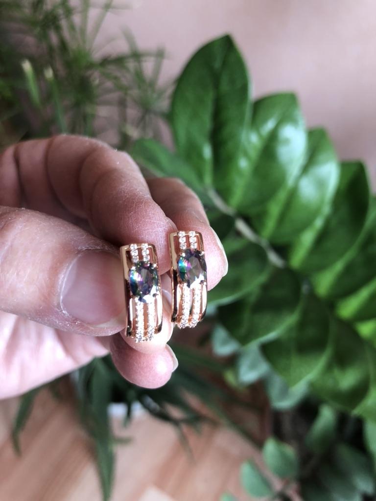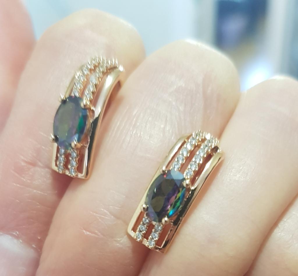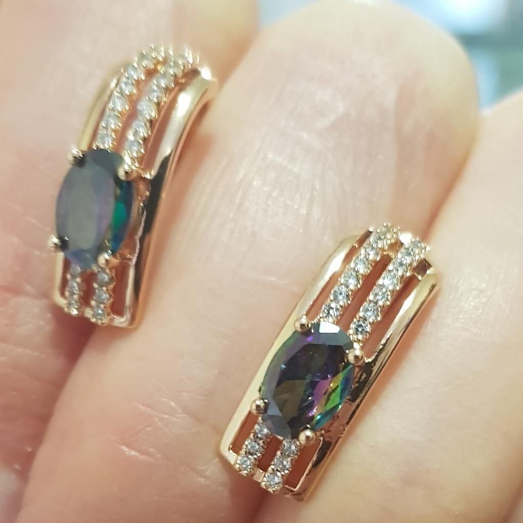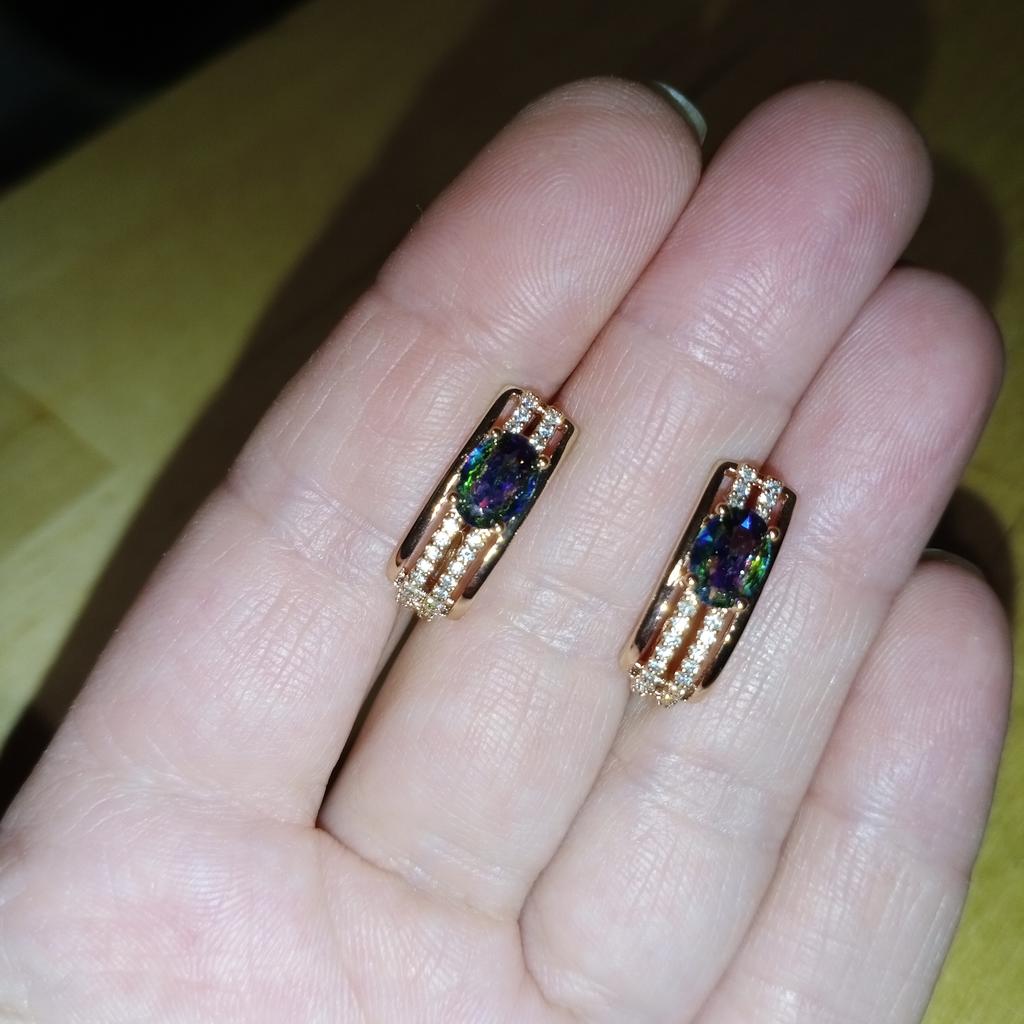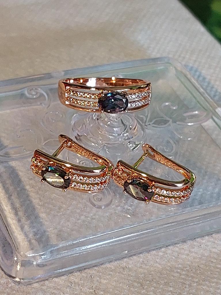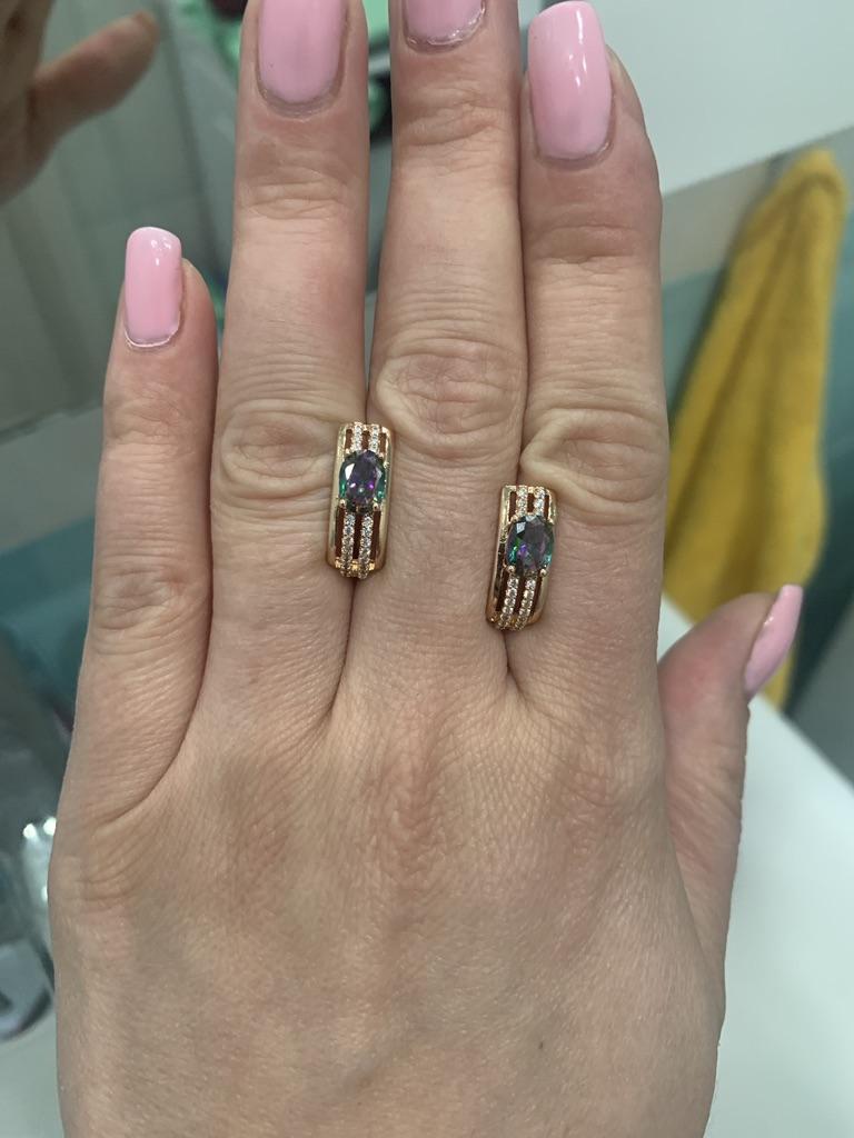 The earrings are beautiful, neatly made, but they look massive. A little too big for me, the holder that is inserted into the ear, you need to have a transparent kapron pusette to pull the earring up to the ear, because it turns around with the central stone to the bottom. The central stone is iridescent from pale green to the pink color, I like it. I ordered a 7 size ring for the earrings, but it came in a 10. Thank you to the seller, everything is neatly packed and folded in a nylon box.
