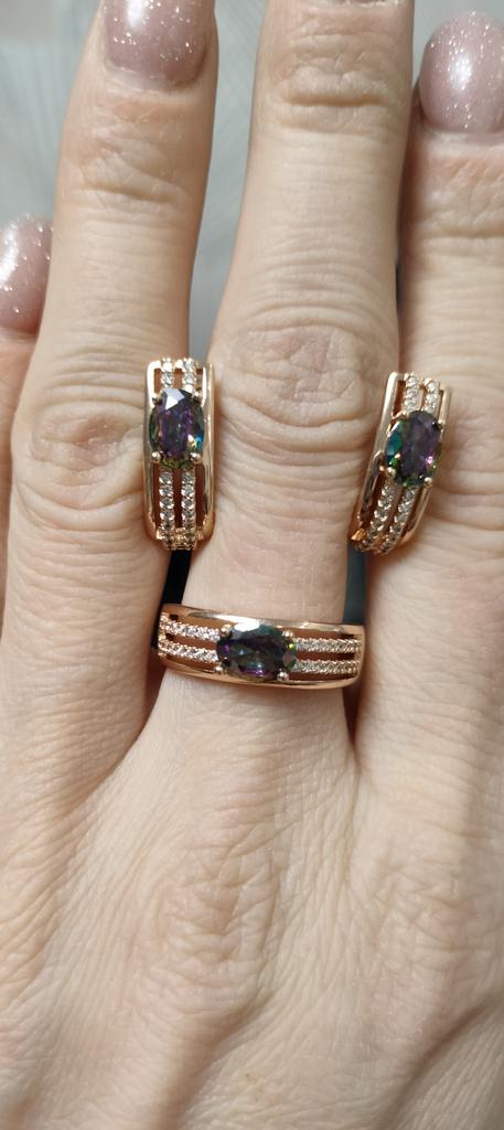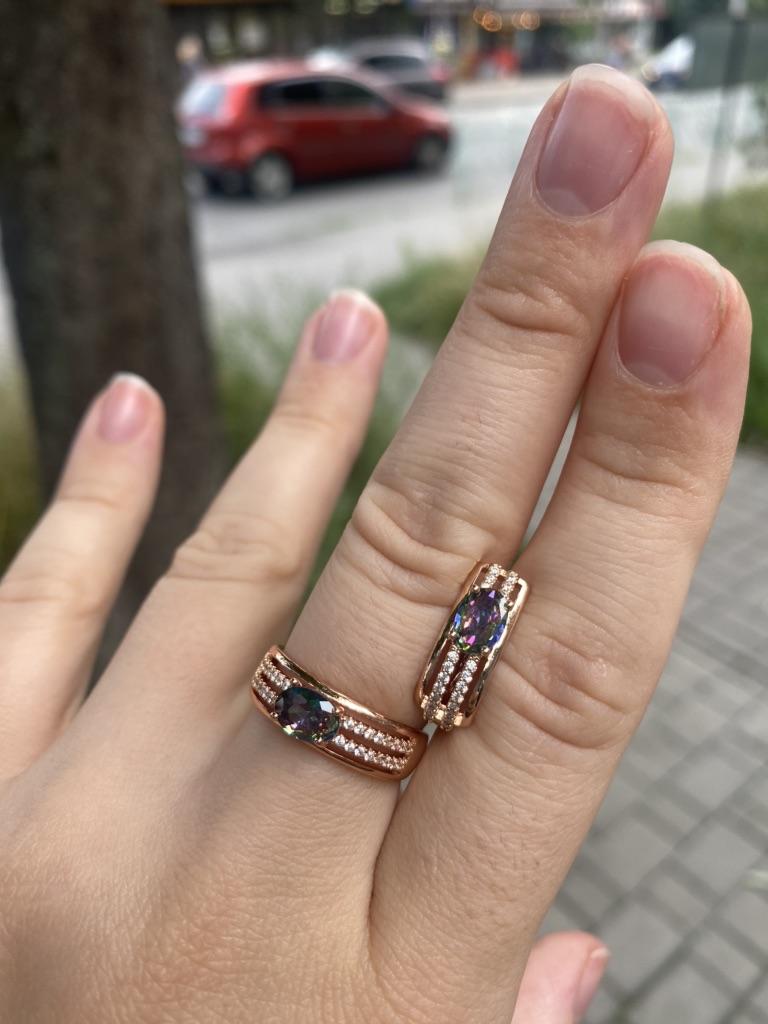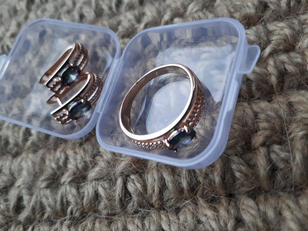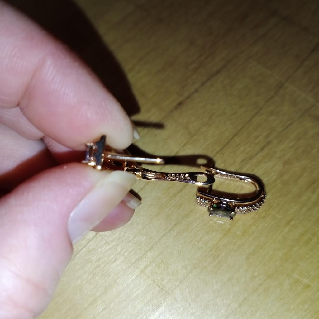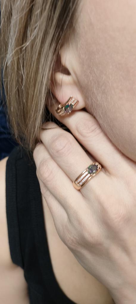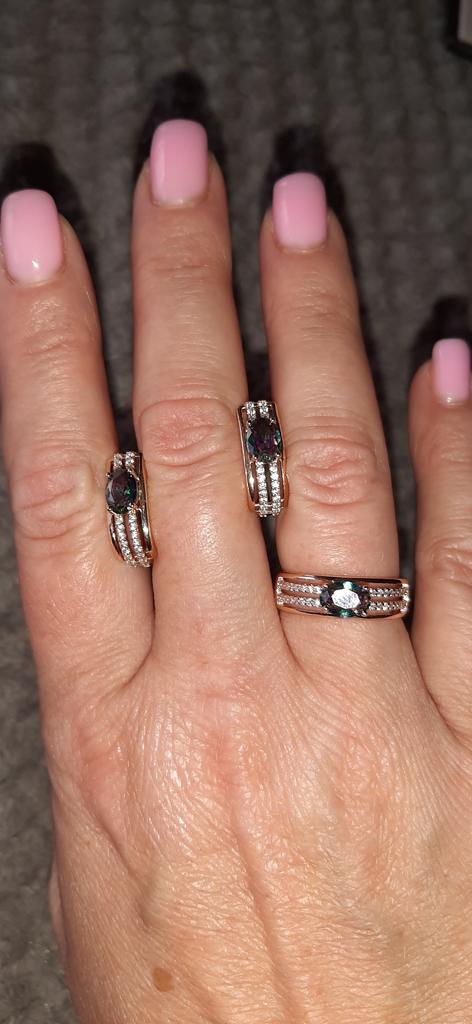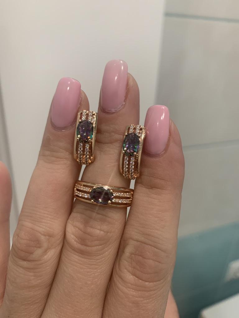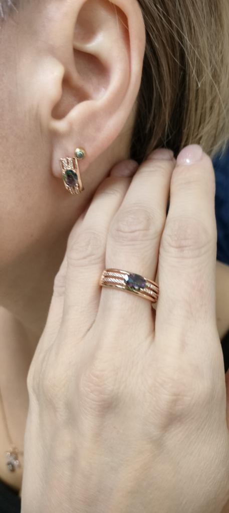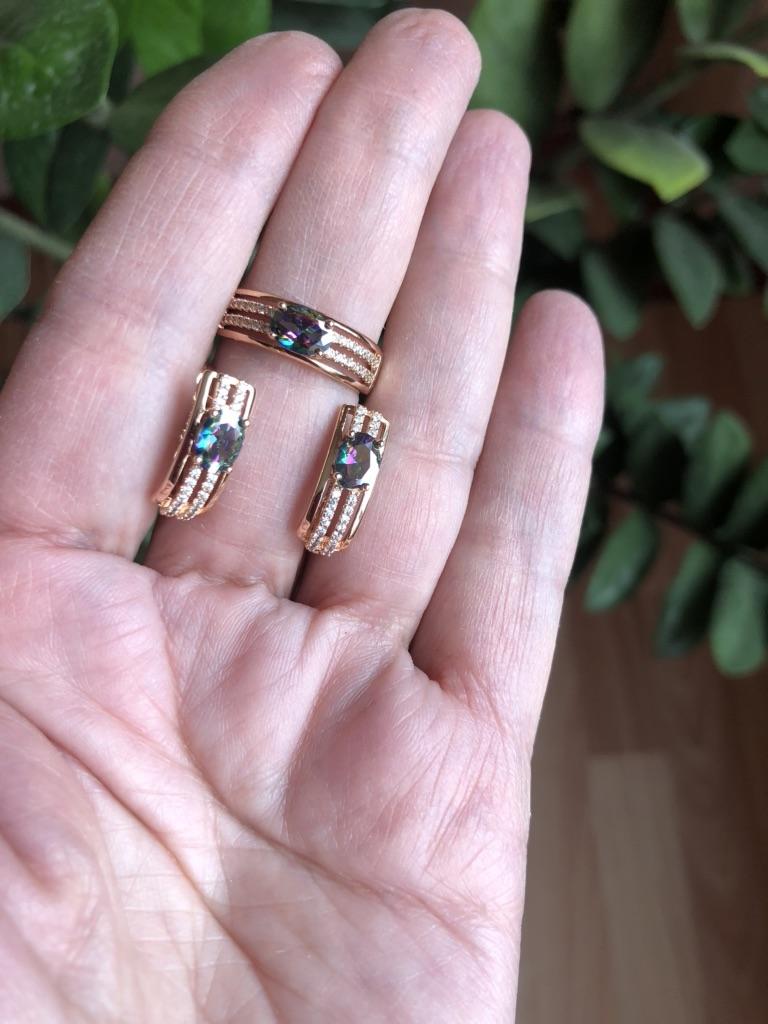 The earrings are beautiful, neatly made, but they look massive. A little too big for me, the holder that is inserted into the ear, you need to have a transparent kapron pusette to pull the earring up to the ear, because it turns around with the central stone to the bottom. The central stone is iridescent from pale green to the pink color, I like it. I ordered a 7 size ring for the earrings, but it came in a 10. Thank you to the seller, everything is neatly packed and folded in a nylon box.