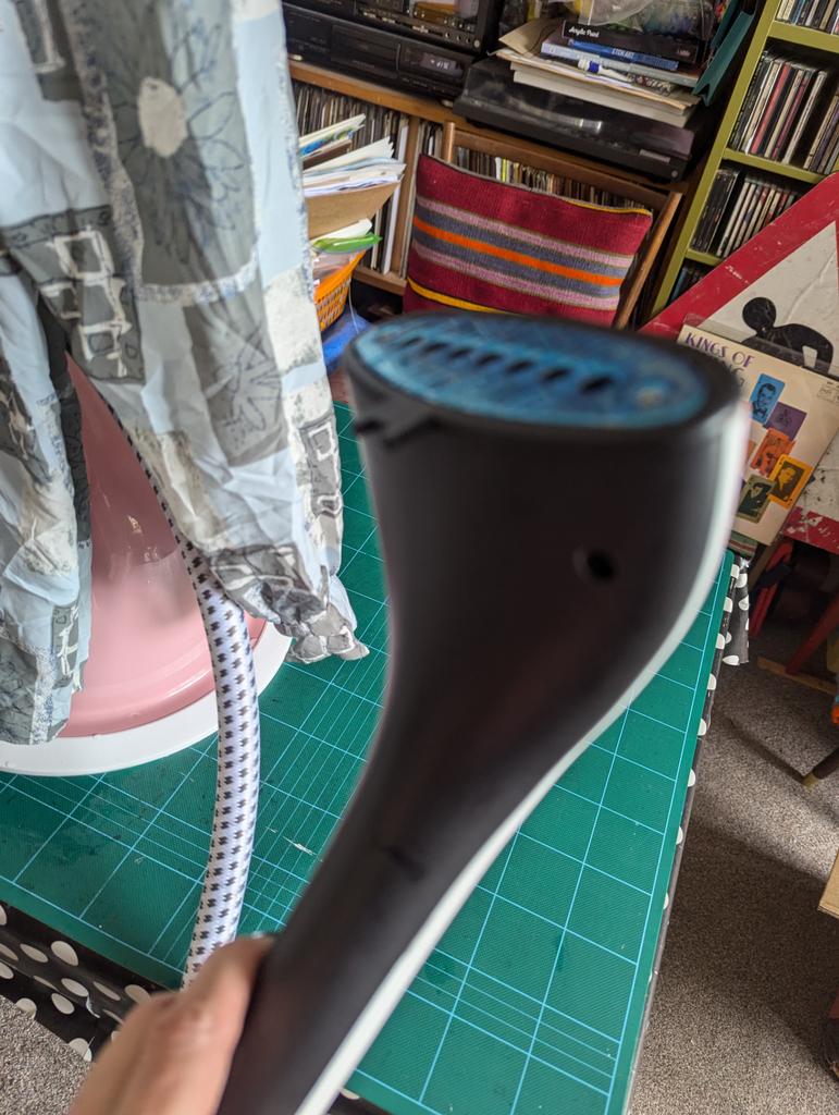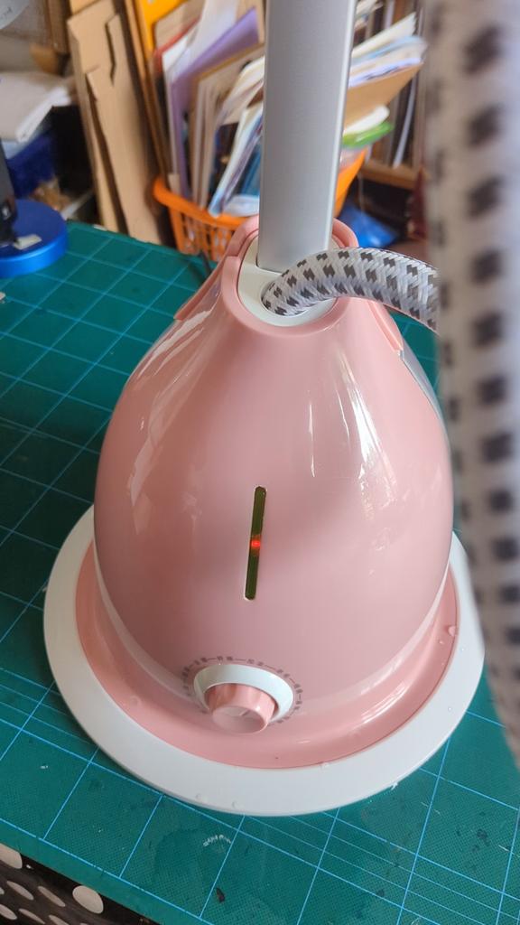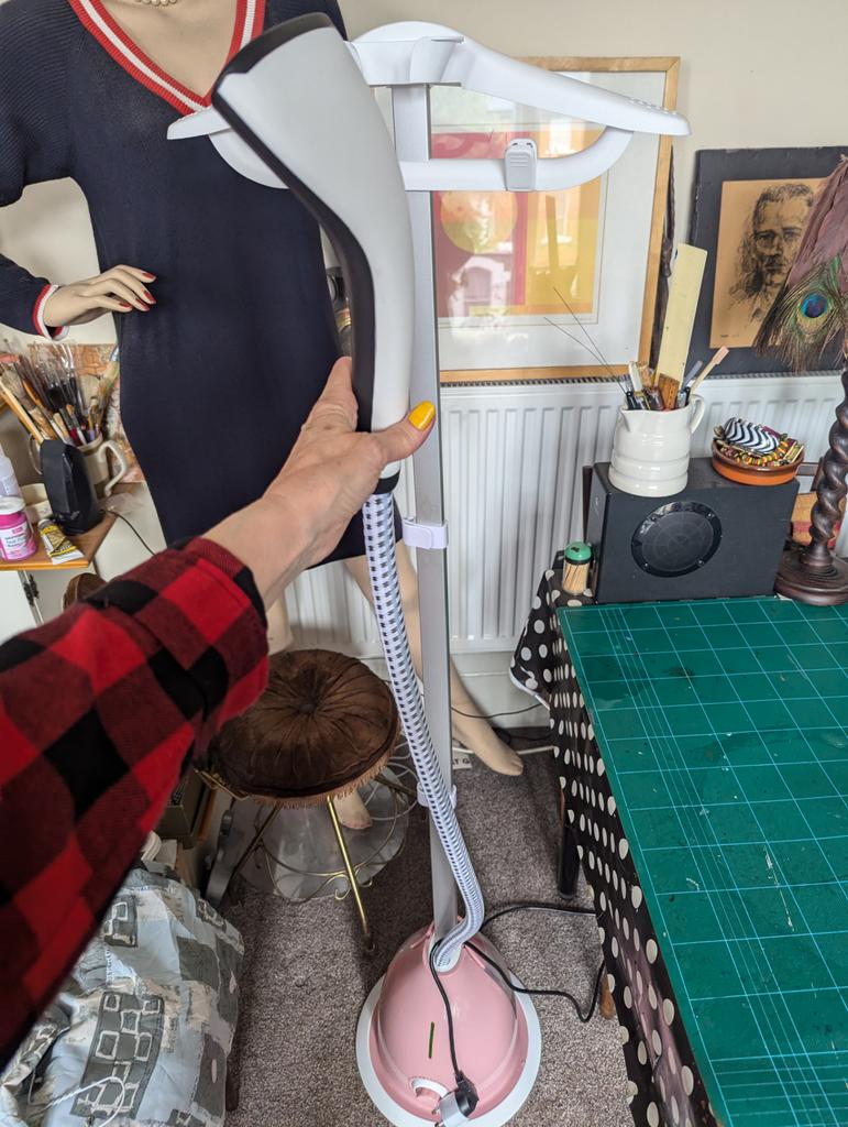 This is super tacky. There's so much wrong. It has a foreign plug so they provide an adapter! It's made of cheap plastic. It is so lightweight I doubt there's any metal in it. The pole, made from the cheapest aluminium, if it is even metal, has a raw edge that just pokes into a slot in the base with nothing to secure it. The pole extends to only 4'9" and the steamer doesn't even extend that high, so you can't put it into the cradle at the top unless you lower the pole to 4'7". The dress in the picture is only a midi and is nearly to the floor. The garmet hanger is cheap plastic with no proper hook to hang garment. You dont always want to use the hanger part. I never did on my old steamer, just a hook. There's no handle or means to carry this without lifting from the bottom, which I had to do to put on a table to work as it's too low for me otherwise. I would get a back ache bending over the whole time otherwise. The water container has a tacky yoke at the top, which is just decoration, but could've incorporated a handle for carrying. My old steamer had that. The water container has a flimsy vacuum stopper that leaks. The steamer leaks while using. The dial has numerous markings, presumably from low to high, but the dial turns around freely the whole way round. I used it to steam one shirt and it used half the water. The next item it started spluttering, and steam would just stop coming out. It started making funny noises so I stopped using it. It is a no from me.
