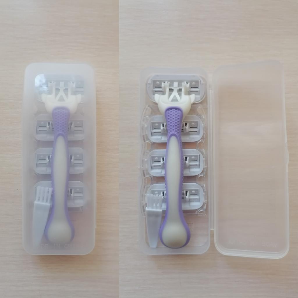 Everything as pictured. Razor, 4 triple-blade heads, and a brush for removing hair in a sturdy, transparent case. Haven't used it yet, but I already like it!