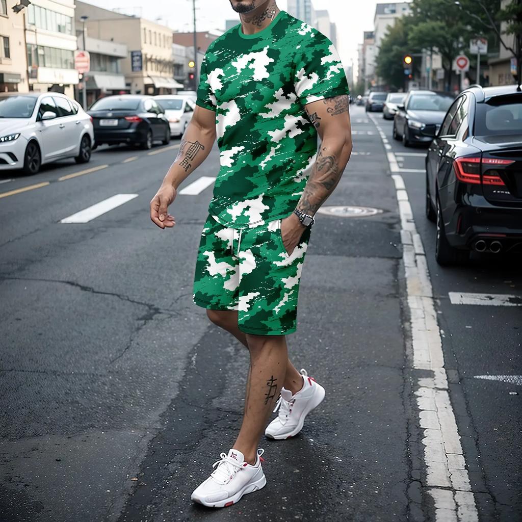 Two Piece Men's 3D Retro Military Style Summer Set Men's Short Sleeved T-shirt and Fashionable Shorts Travel Street Set