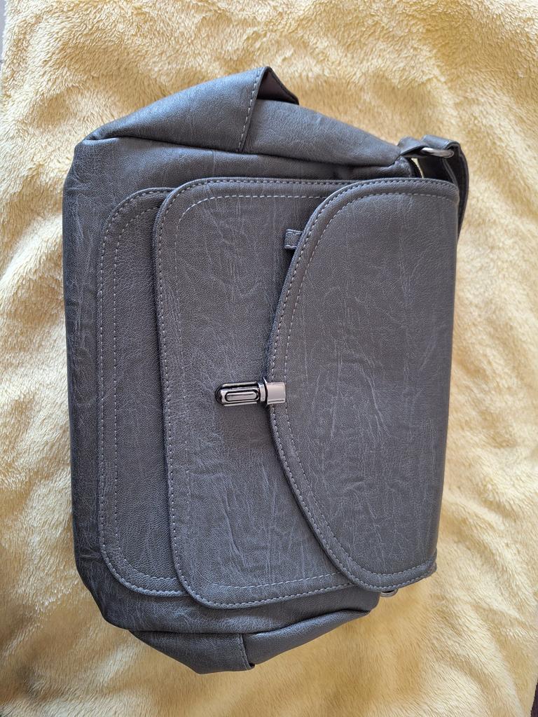 Everyday bag. Zippers work well. Style without frills. Material is pressed leather. Shoulder strap is wide. Lining is ordinary thin fabric. Keys need to be put in the internal zippered pocket. Otherwise, they will fall behind the lining.