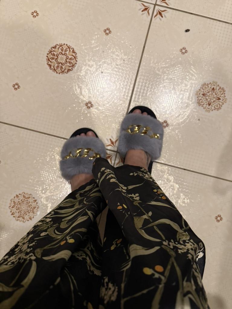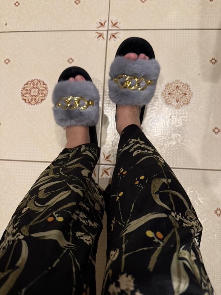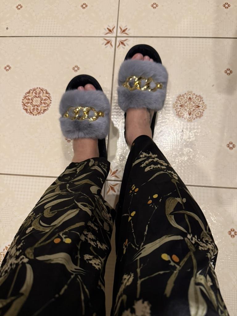 New Autumn and Winter Metal Chain Slippers for Women, Fashionable and Warm, Big Fur Flat Heel One Line Slippers
