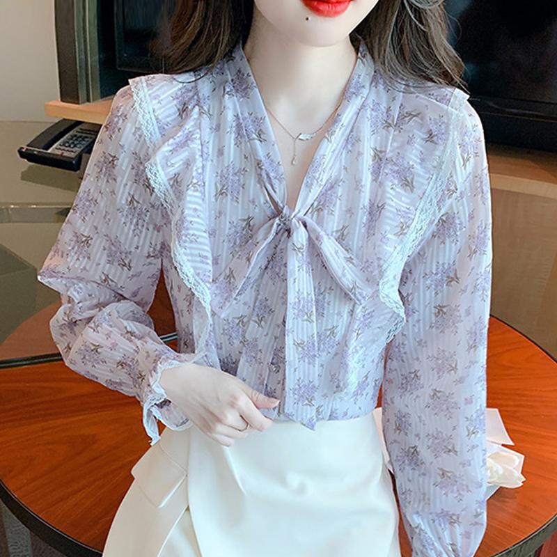 Fashion New 2024 Autumn Casual Long Sleeve Bow Collar Ruffles Print Chiffon Blouse Shirt Women Tops Blouses Shirts J510