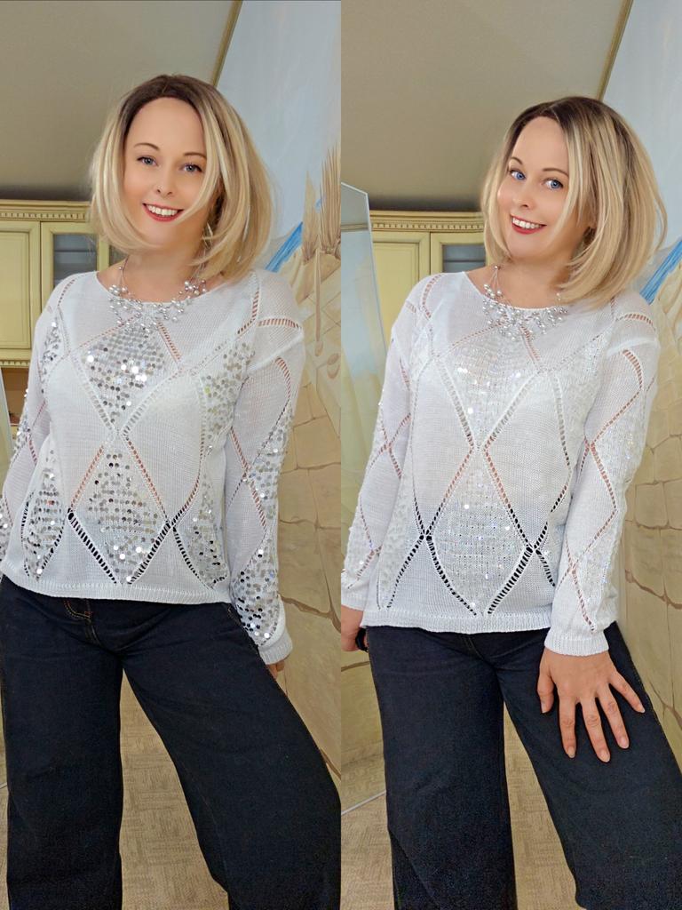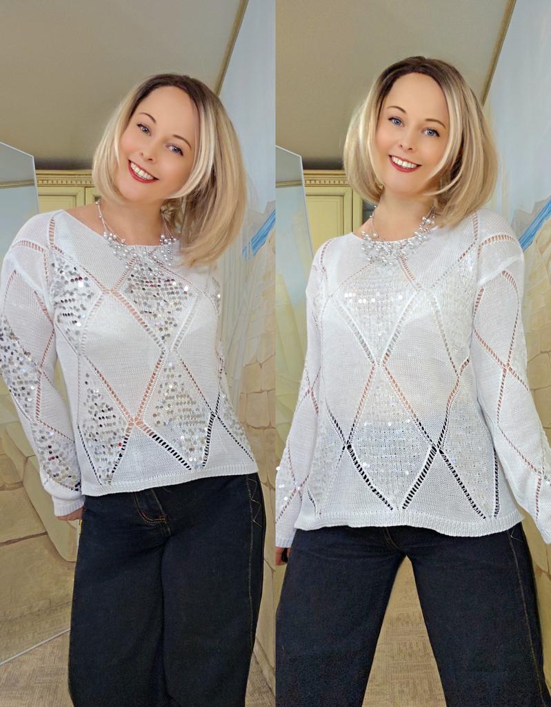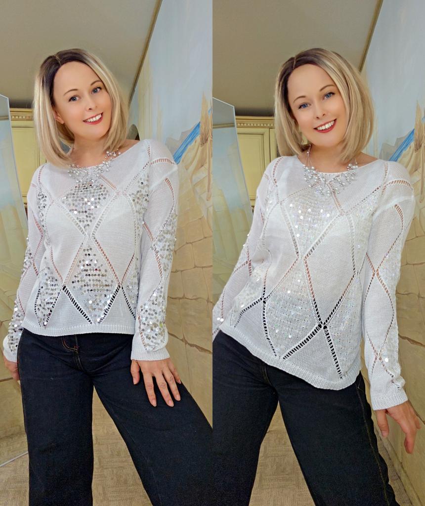 I give stars only for the quality work of SP! The knitwear is good, the sequins are sewn on poorly, the fishing line sticks out, several sequins have fallen off!