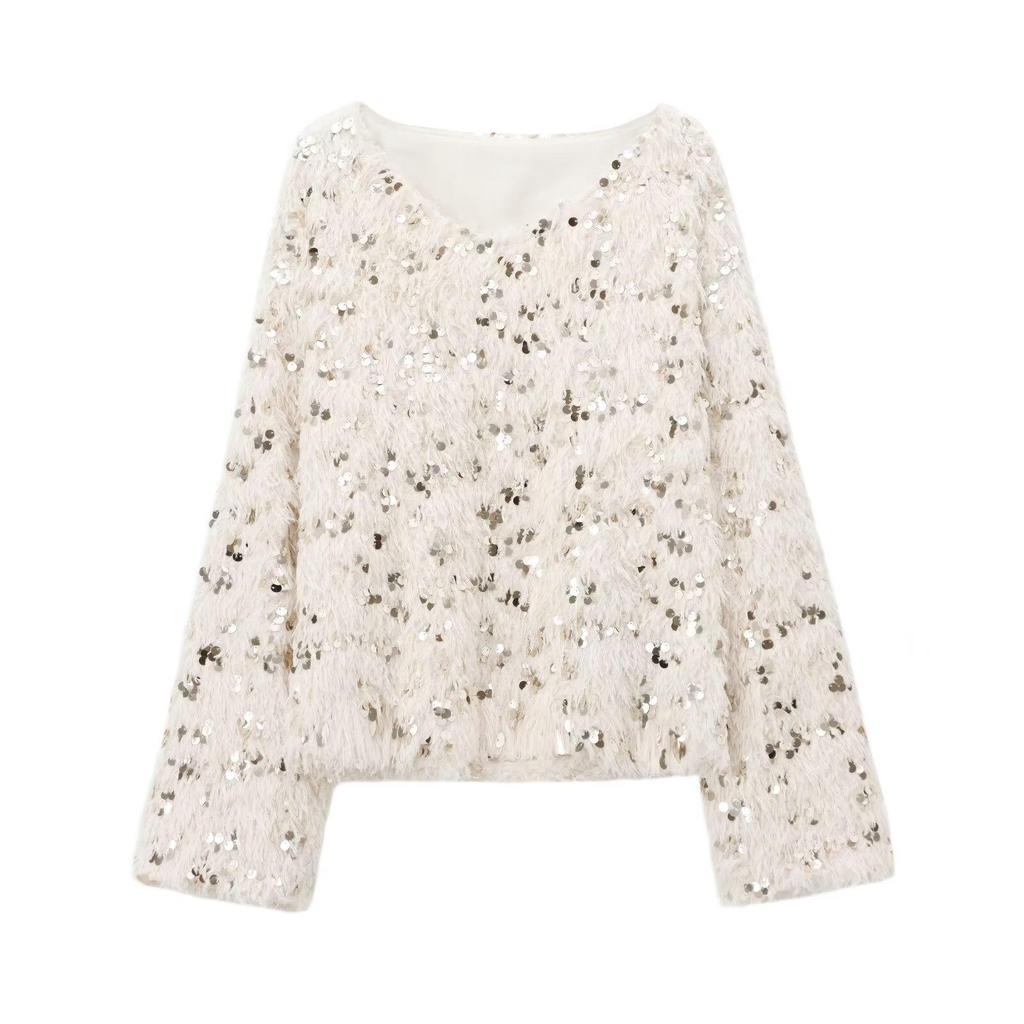 Embrace a blend of elegance and comfort with this stunning autumn/winter knit sweater. Crafted from high-quality polyester, it features a delicate sequin embellishment that adds a touch of sparkle to your outfit. Designed with a loose fit, this thin sweater offers a relaxed silhouette, perfect for layering during the cooler months. The V-neckline adds a flattering detail, while long sleeves provide extra warmth. Thoughtfully adorned with tassel accents, the sweater also includes practical pockets, making it both stylish and functional. Ideal for those looking to make a fashionable yet cozy statement this season.