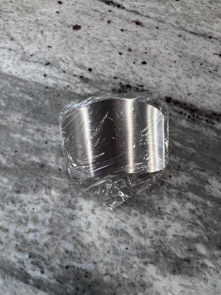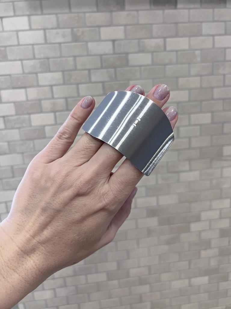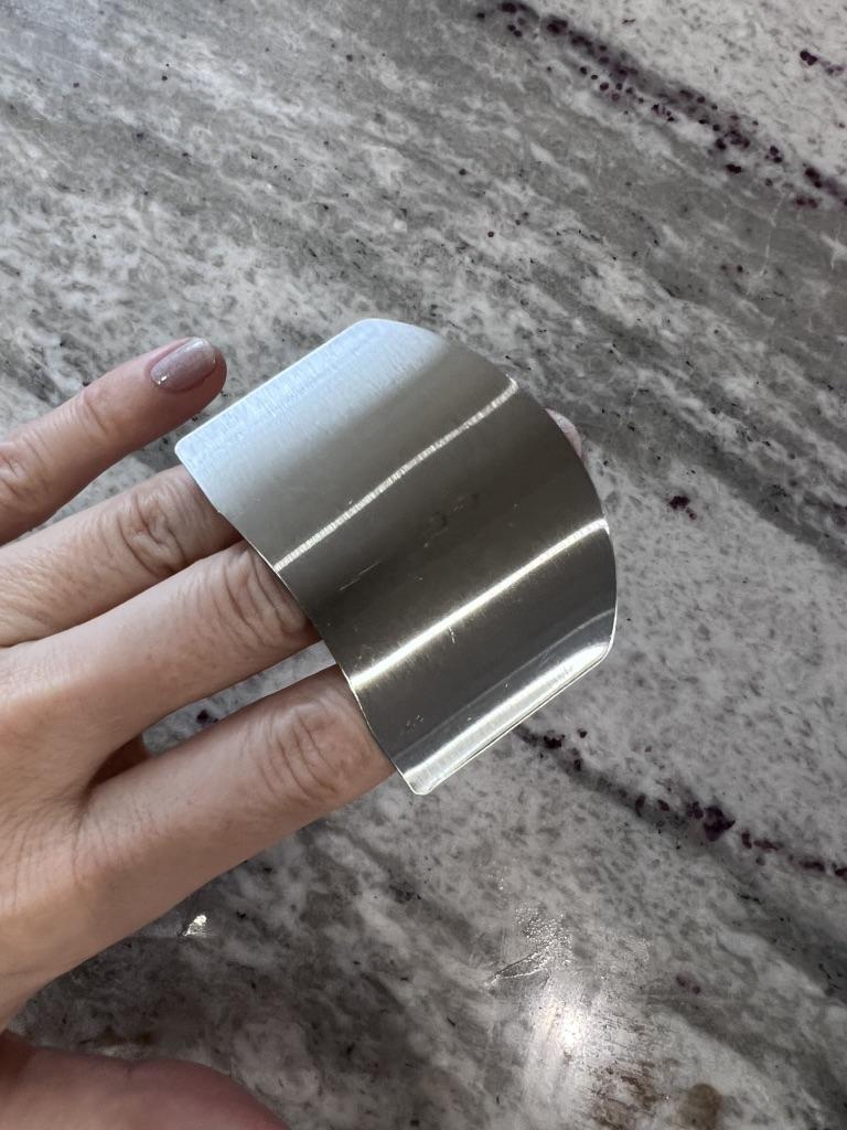 Features a curved shield that protects the nails and fingertips from the knife's edge. Adjustable Ring: On the back it includes a metal ring that can be adjusted to the size of the middle finger, allowing to hold the food firmly while the knife is slid against the shield.