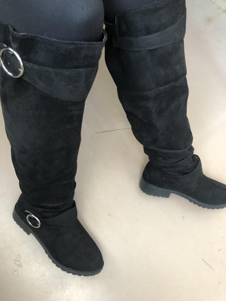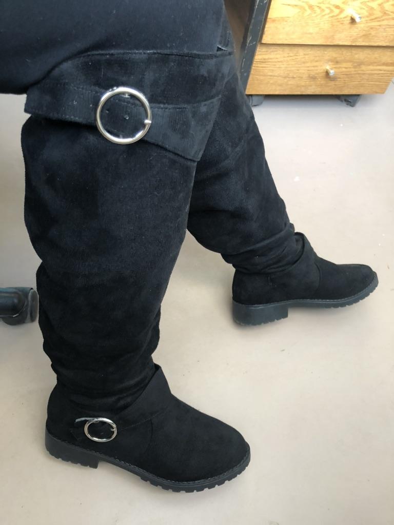 Women's Solid Color Trendy Boots, Buckle Belt Pull On Chunky Heel High Knee Boots, Winter Round Toe Slouchy Boots