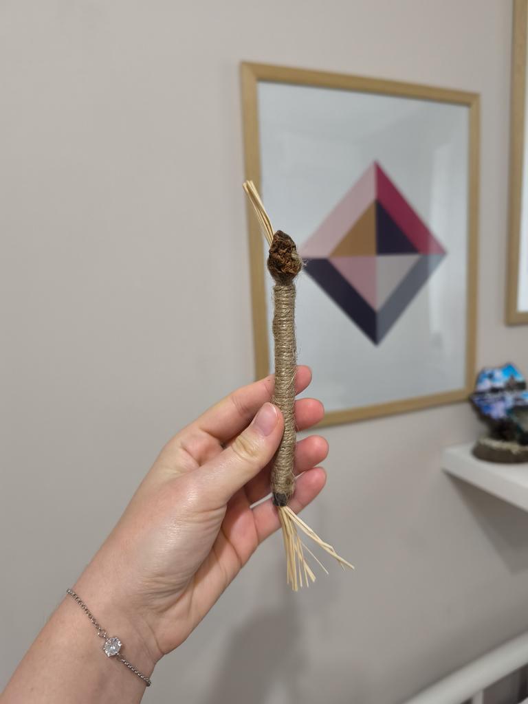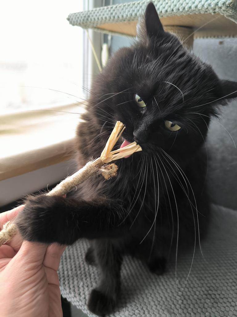 * Cat toy with sisal * 💥𝗟𝗶𝗲𝗳𝗲𝗿𝘇𝗲𝗶𝘁 20 days 💥𝗟𝗶𝗲𝗳𝗲𝗿𝘂𝗺𝗳𝗮𝗻𝗴 Included in the delivery is 1 cat toy in the corresponding design. There is no other version. It was packaged rolled up in a plastic bag. 💥𝗤𝘂𝗮𝗹𝗶𝘁ä𝘁 The cat toy is made of natural materials like sisal and is about 22 cm large (see photo). At the end there is still a small, indefinable dried piece (I suspect some kind of fruit). My cat was initially very interested in it and sniffed it, but she hasn't played with it at all for a week so far.. Also, this cat toy doesn't seem to emit any particular scent or anything like that.. However, I like that it was made from natural materials and wrapped with sisal, so the cat could sharpen or wet its claws on it.. For material composition : I suspect natural materials like sisal, but I haven't found a label or anything similar 💥𝗙𝗮𝘇𝗶𝘁 This cat toy was not accepted by my cat at all, unfortunately 🤔😕 Therefore 2 stars 🌟 🌟 deduction, as the sense and benefit of it do not become clear to me..