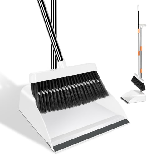 Almcmy Broom and Dustpan Set, Freestanding, Long Handle, Indoor/Outdoor Use, Adjustable Length, Easy Assembly, No Bending, Windproof, Suitable for Flo