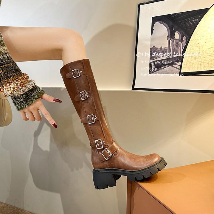 Cowhide Version~ British Style Belt Buckle Boots 2025 Spring and Autumn New Side Zipper Knight Boots Women's Long Boots