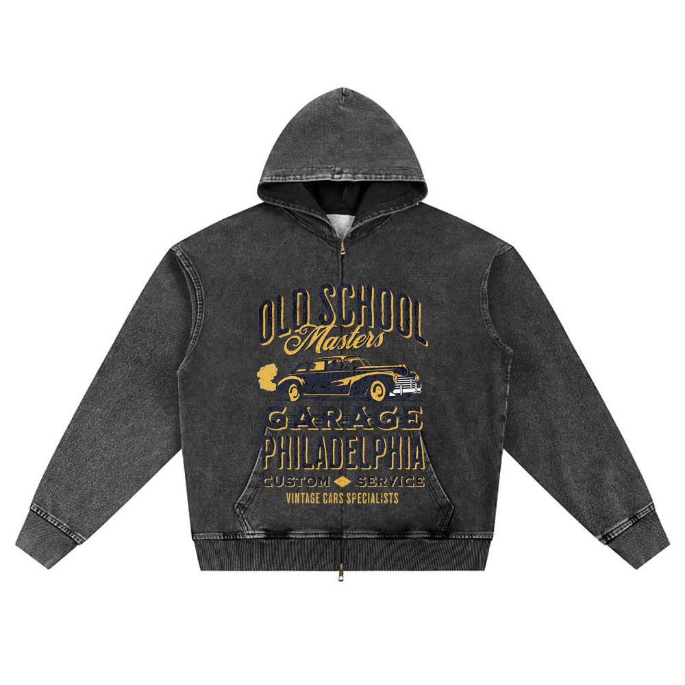 DTG Print Knitted Denim Zip-Up Hoodie Old School Garage Philadelphia Car Brother Print Zipper Hoodies