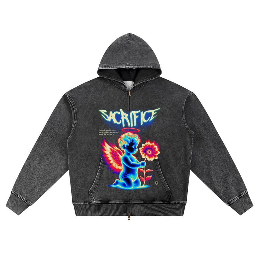 DTG Print Knitted Denim Zip-Up Hoodie Streetwear Brother Print Zipper Hoodies