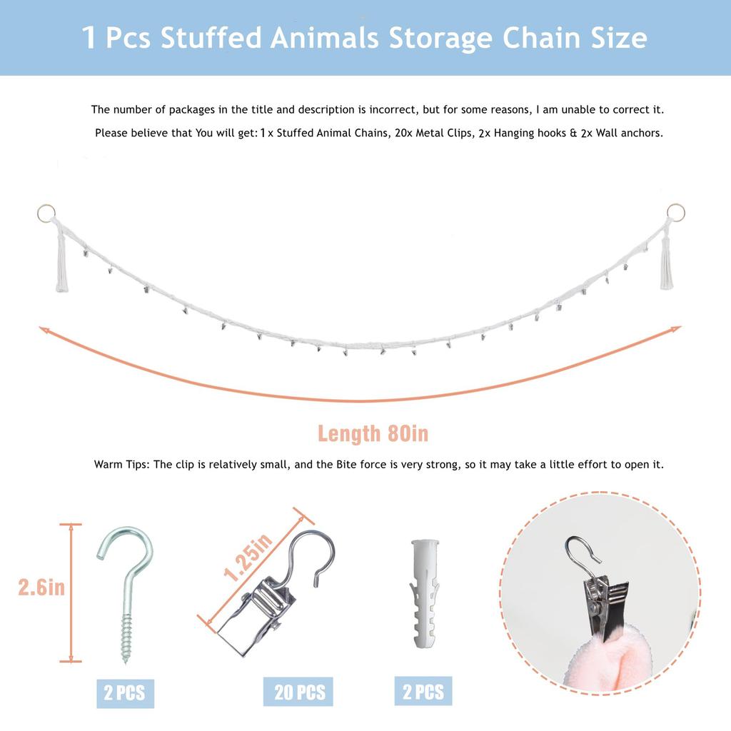 Cotton Plush Animal Storage Rope with 20 Metal Clips, Wall-mounted Hanging Storage Rack, Suitable for Kindergarten Playrooms