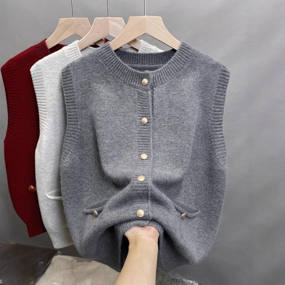Women Knitted Sweater Vest Women Gold Buckle O-Neck Sleeveless Chic Red Knit Pullovers Soft Elegant Sweater Fall Winter Vests Clothing