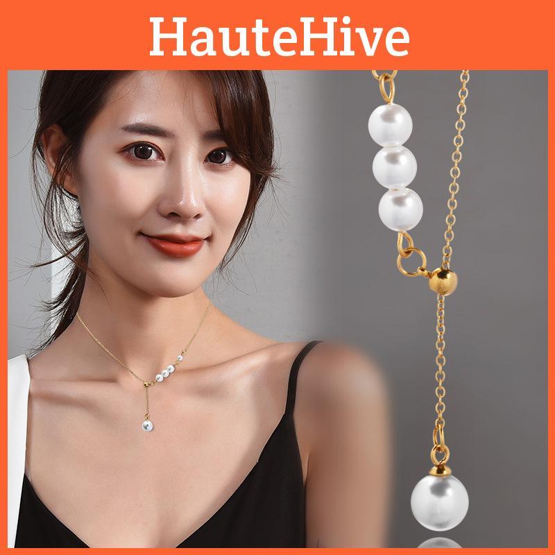 The necklace features an elegant water wave chain that adds a touch of fluidity and grace. The delicate leaf-shaped pendant, meticulously crafted from titanium steel, delicately holds the pearls, creating a harmonious balance between nature-inspired design and modern aesthetics. This necklace is not just an accessory; it's a statement piece that tells a story, making it a must-have addition to any jewelry collection. Elevate your style with this exquisite Titanium Steel Y Shaped Pearl Necklace and embrace the elegance it brings to your ensemble.
