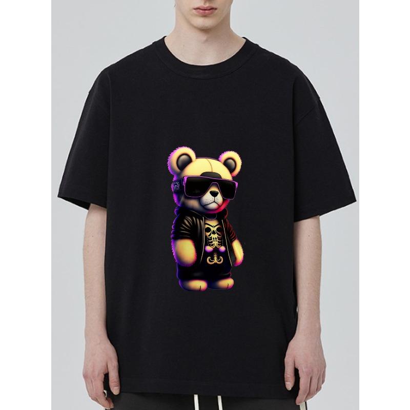 Black T Shirt with Cartoon Bear Wearing Sunglasses and Skull Design for Casual Wear