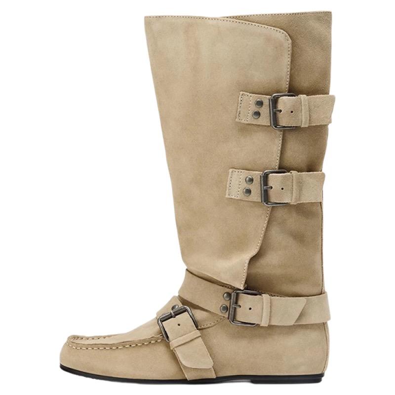 Women's Suede Mid Boots Buckle Straps Retro Style Comfortable Flat Heel Fashionable Daily Wear Versatile Autumn And Winter
