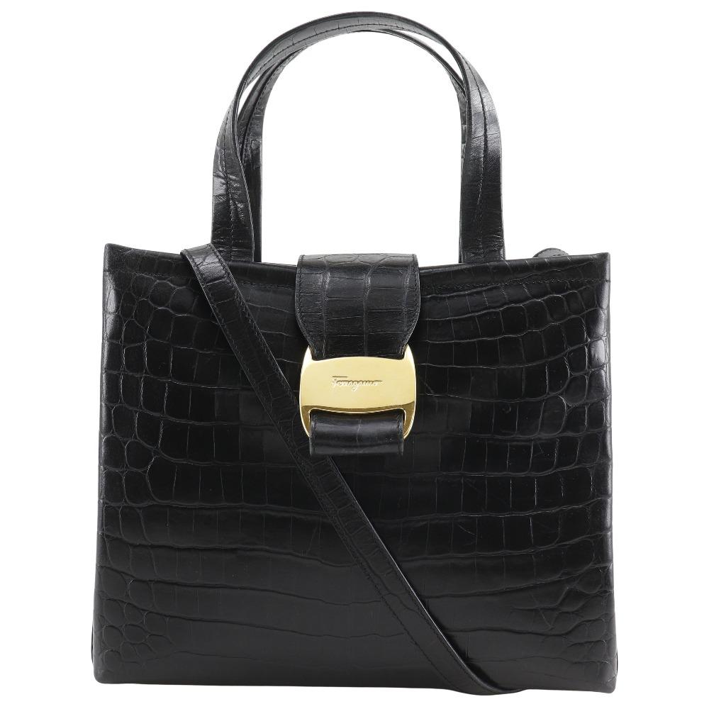 Salvatore Ferragamo Vala Handbag AQ-21 8252 2WAYShoulder Black/gold Embossed Leather Women Used
