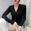Sexy Cross V-neck T-shirt for Women In Women's Long-sleeved Autumn Fashionable Design Pleated Top Temperament Waist-hugging Slimming Base Shirt