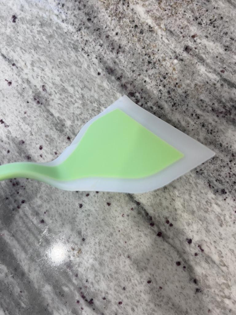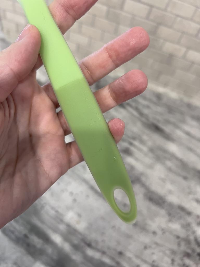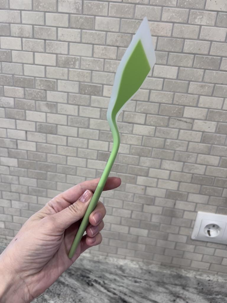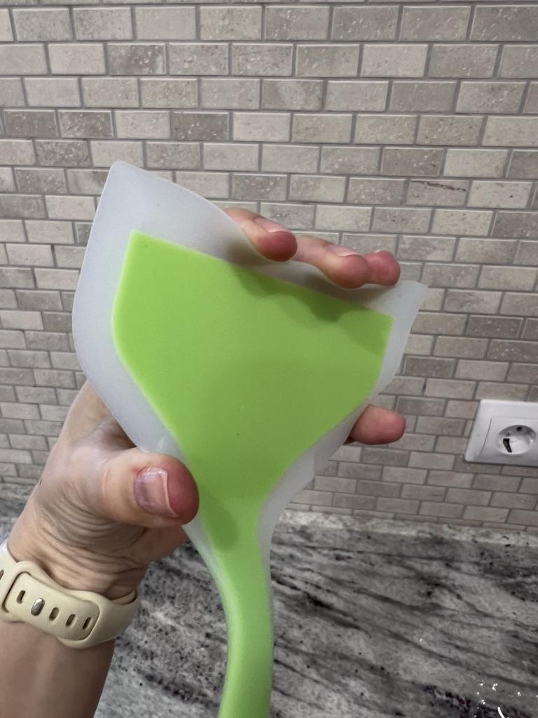 ❤️👍I use a silicone spatula for a non-stick frying pan. The color is light green with a white trim — it looks neat and pleasant, easy to find among kitchen utensils. The silicone is soft and does not scratch the pan surface, which is important for the non-stick coating. The spatula is suitable for everyday cooking.. Moderately flexible spatula: convenient for flipping and stirring food. Comfortable to hold, does not slip. Easy to wash, food residue does not stick. Does not absorb odors during normal use. A practical and convenient silicone spatula that is gentle on non-stick coatings and pleasant to use. I recommend it for everyday use in the kitchen.