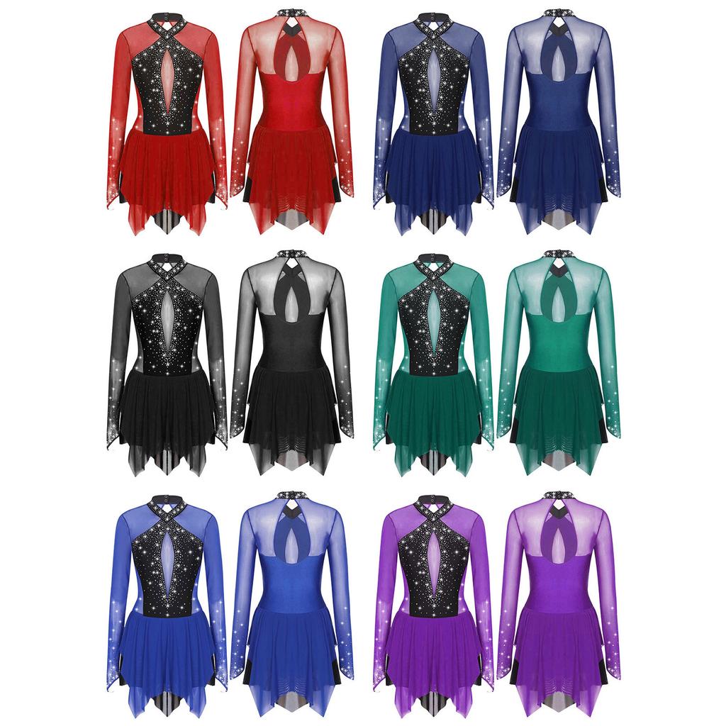 Women's Shiny Rhinestone Figure Ice Skating Dress Long Sleeve Irregular Hem Ballet Skirted Leotard