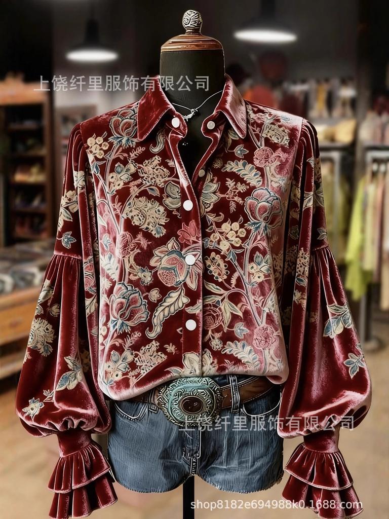 New Creative Fashion Velvet Lapel 3D Print Women's Long Sleeve Shirt