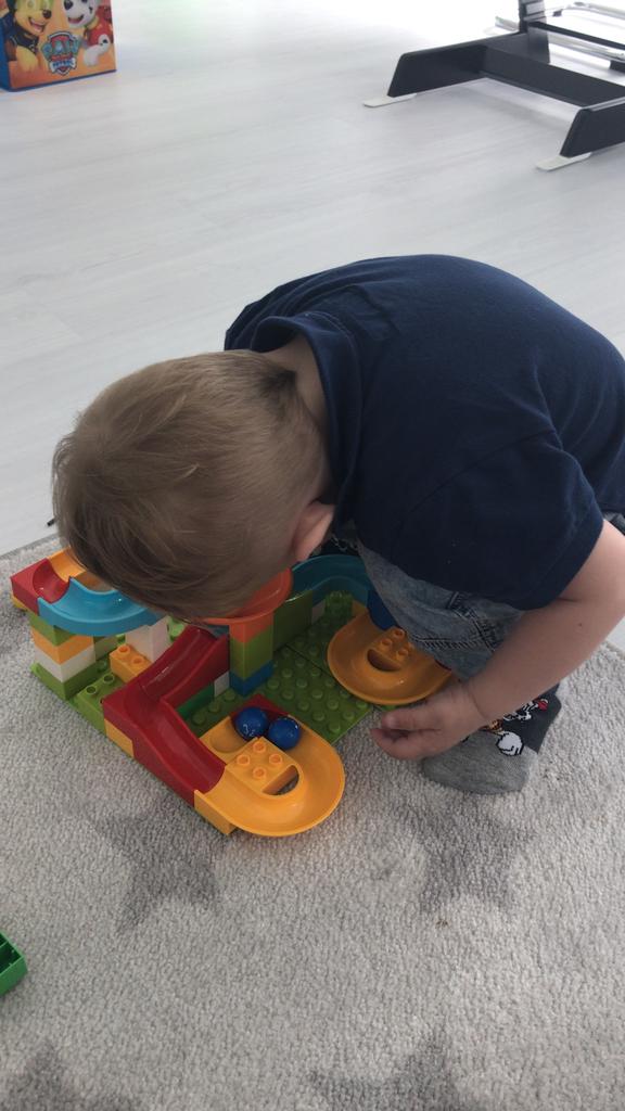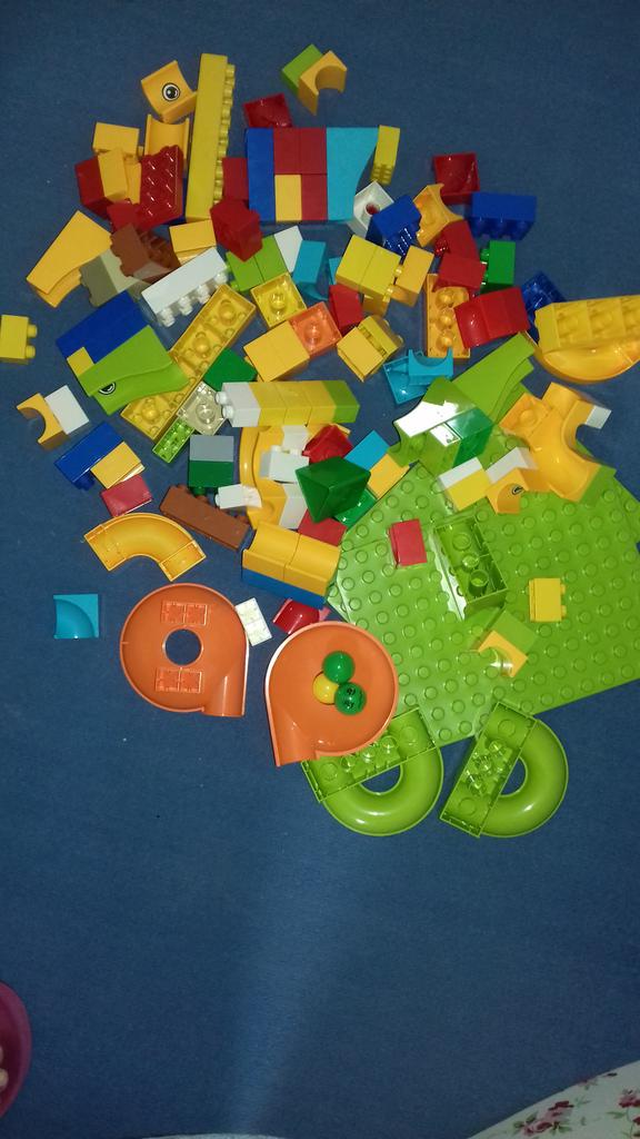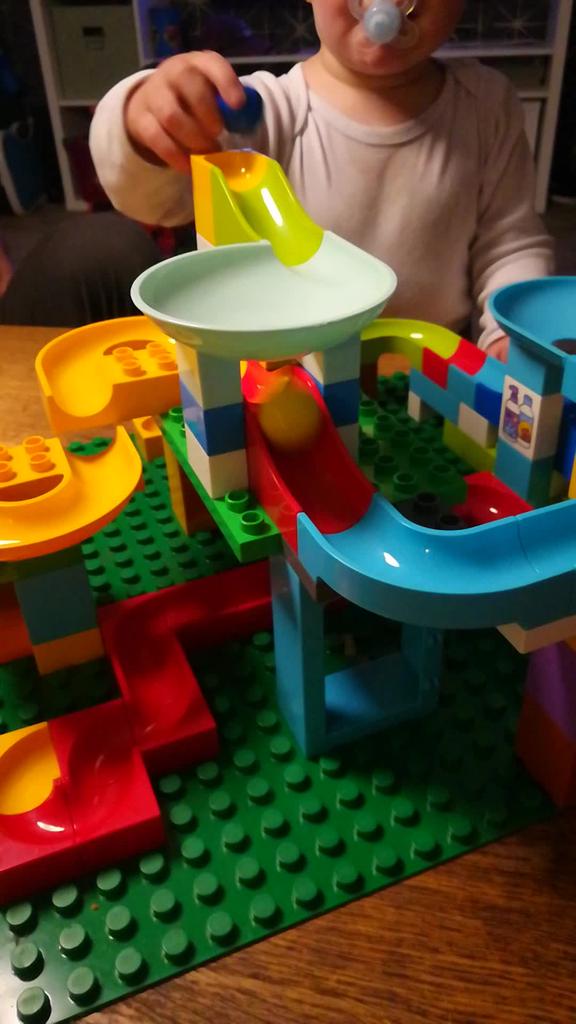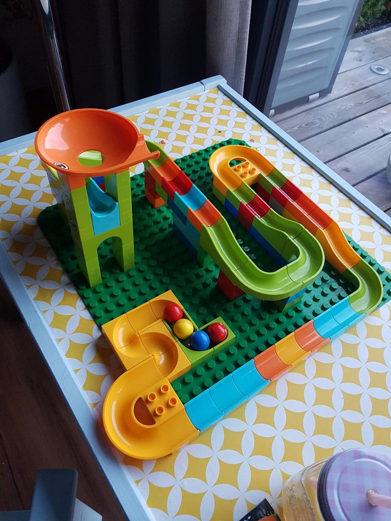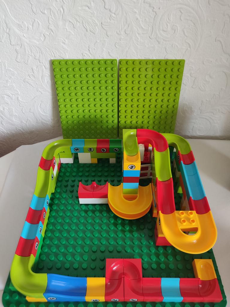 Creo que esta carrera de canicas es genial. mi hijo esta emocionado. La carrera de canicas cabe en los bloques de construcción Lego Duplo. (El panel verde oscuro no se incluyó en el pedido, sino 2 más pequeños detrás). Pedí 104 piezas.