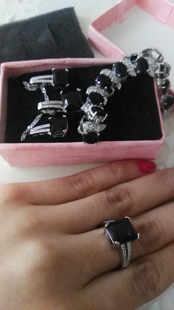 CZ. Conjunto de bisutería con piedras semipreciosas en color negro. Sortija + pendientes + pulsera + colgante con cadena color plata