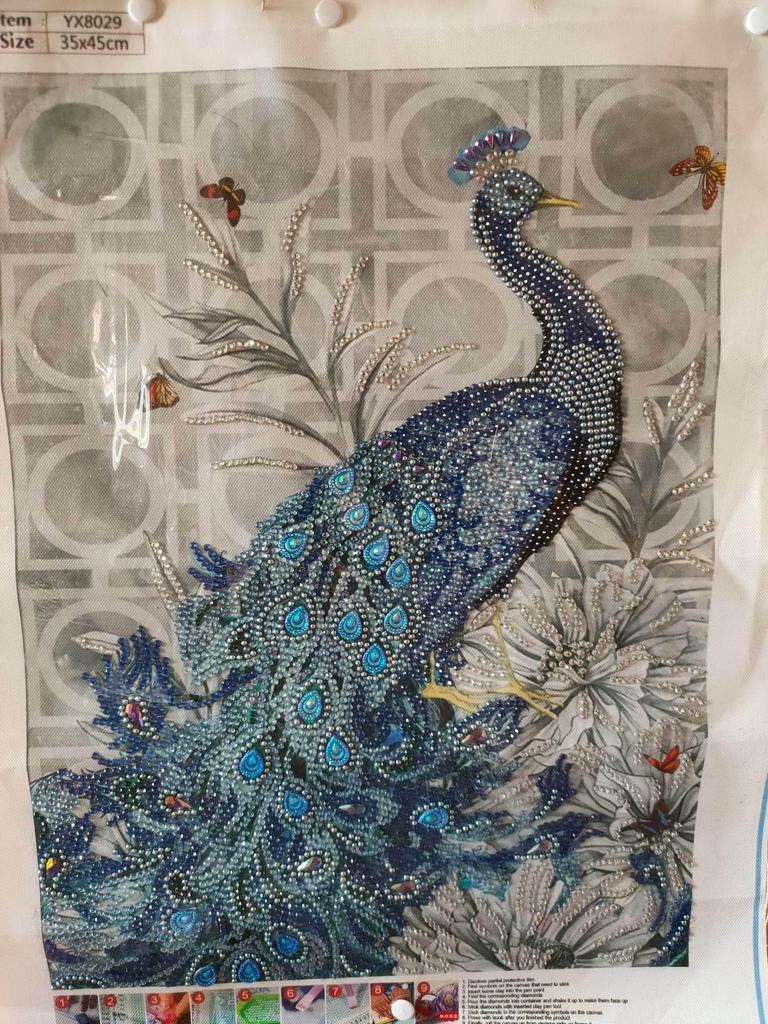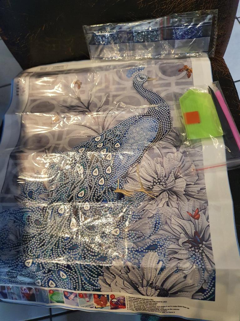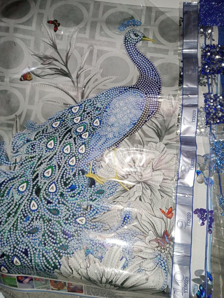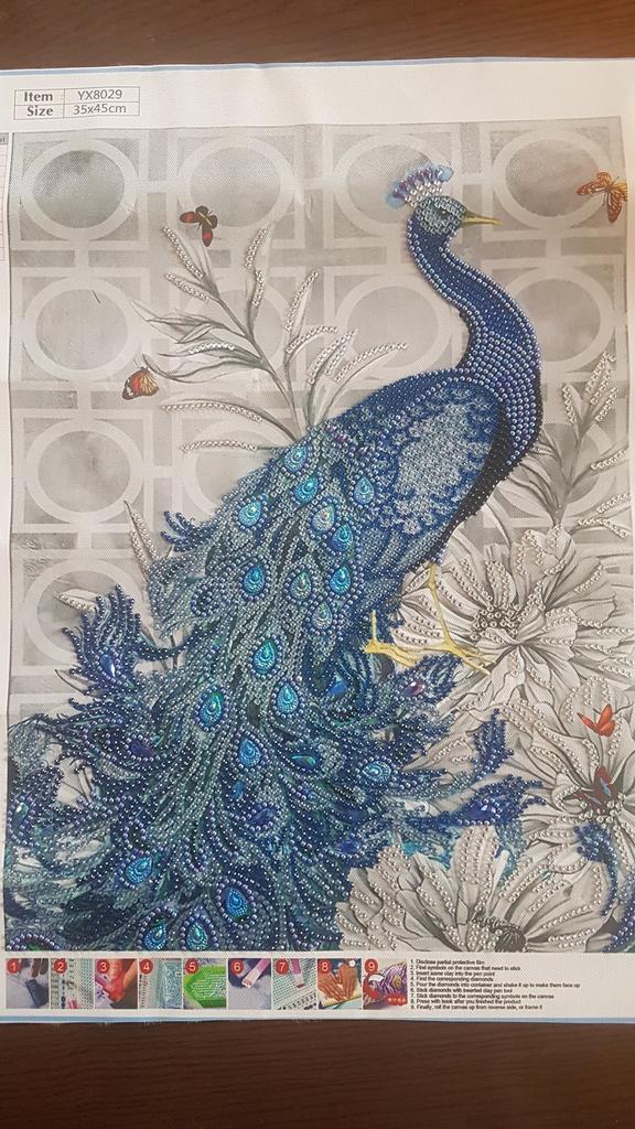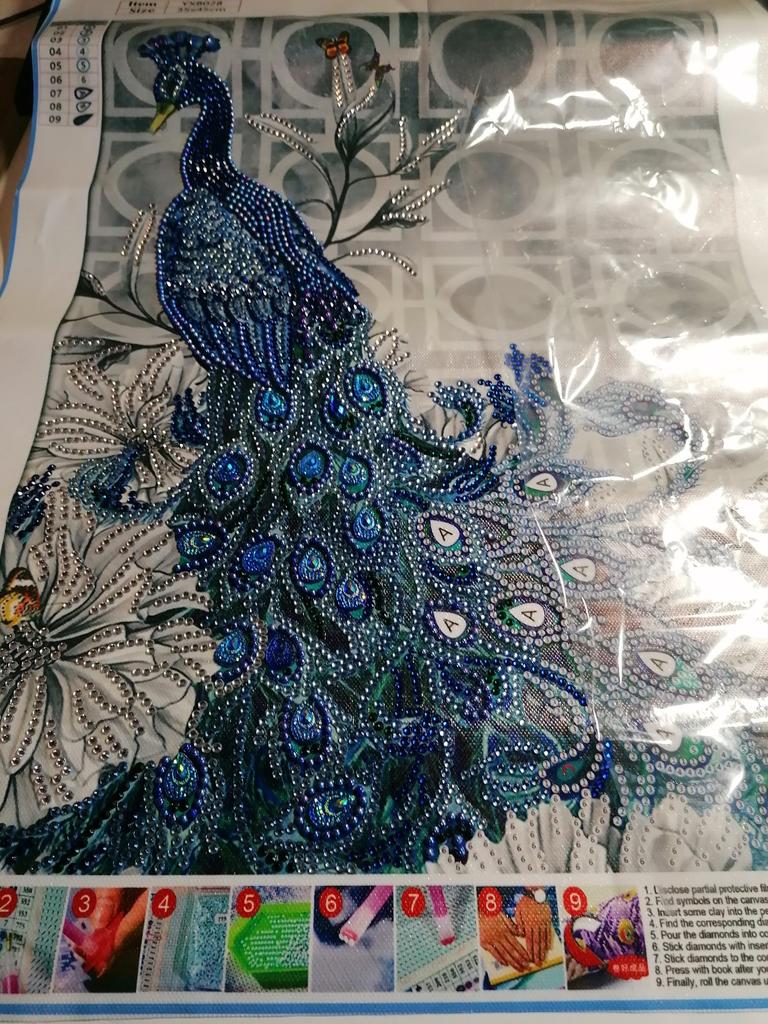 Había leído en algunos comentarios que estas mariposas no están en el fondo de la imagen, pero están en mí. Entonces definitivamente es un error de impresión. Llegó bien empaquetado, solo el pavo real es parte de la edición de la imagen y espero que la los diamantes de imitación están completos.