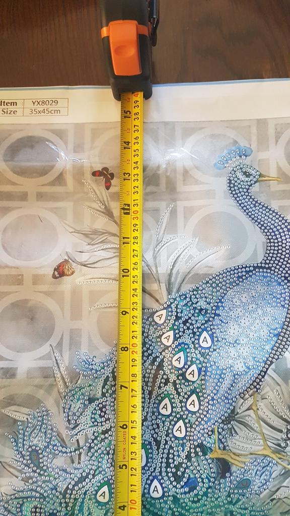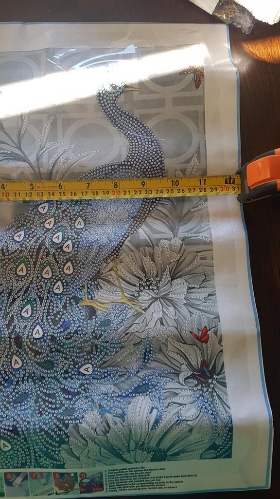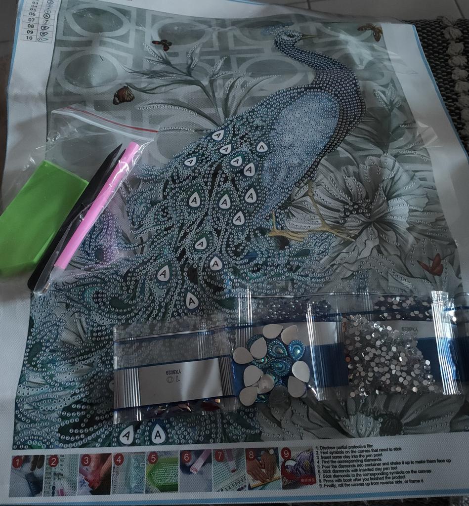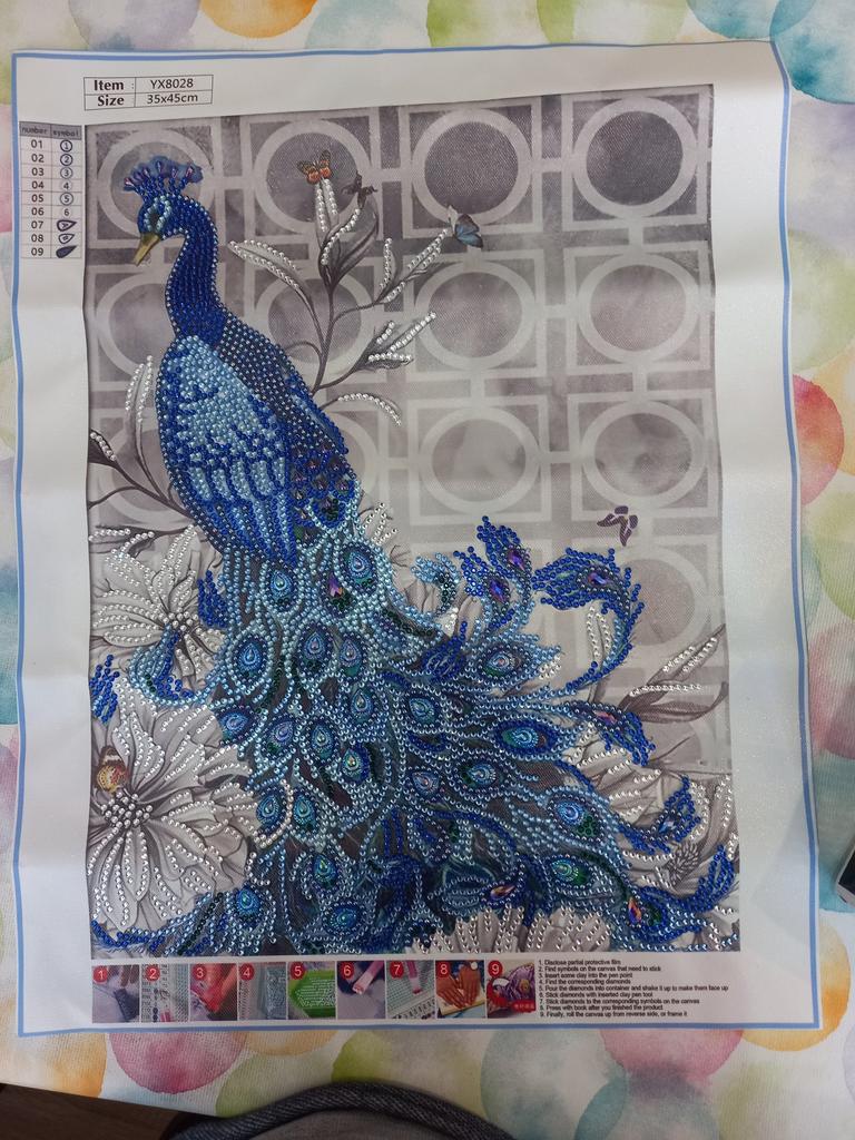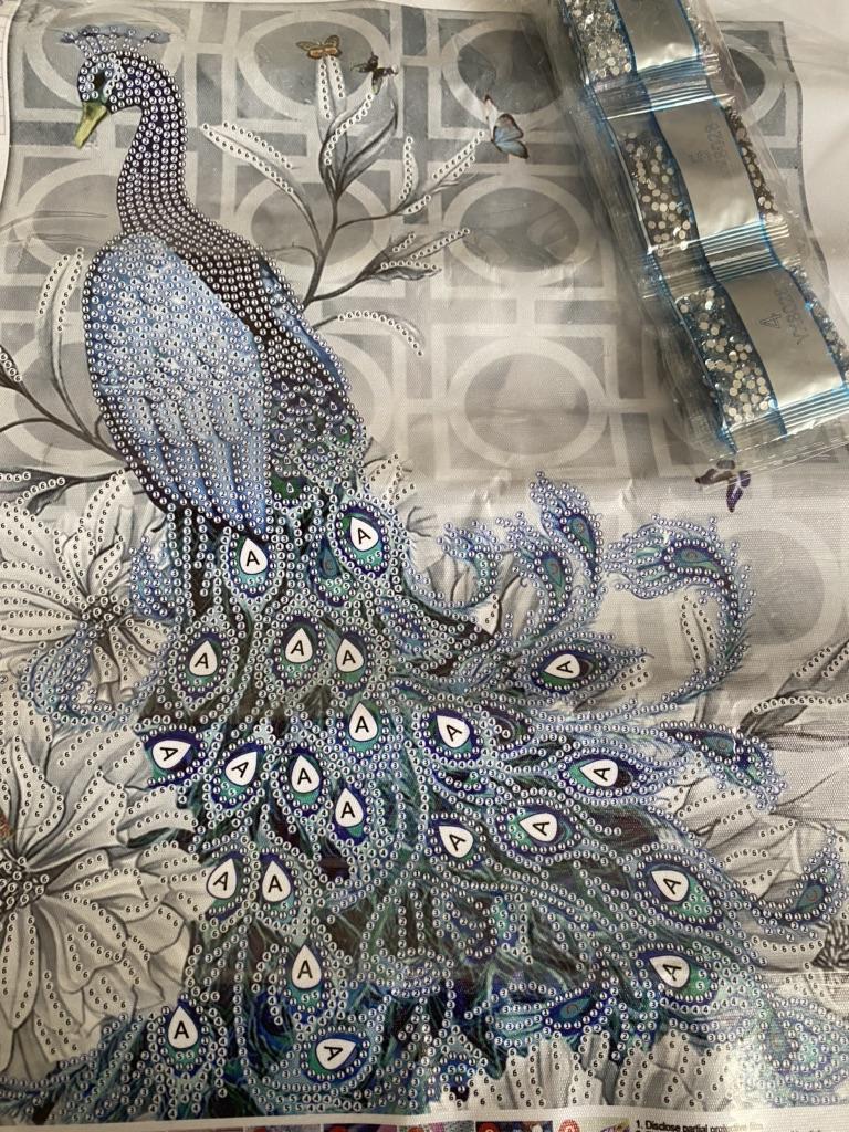 Había leído en algunos comentarios que estas mariposas no están en el fondo de la imagen, pero están en mí. Entonces definitivamente es un error de impresión. Llegó bien empaquetado, solo el pavo real es parte de la edición de la imagen y espero que la los diamantes de imitación están completos.