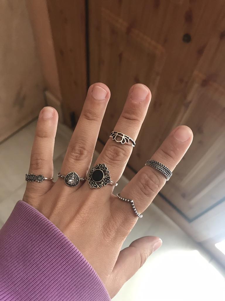 Casi todos los anillos son del mismo tamaño, muy grandes y si tienes manos delgadas no te quedarán como en la imagen (deberían tener más variados los tamaños) y la calidad no es muy buena(mal trabajados)...