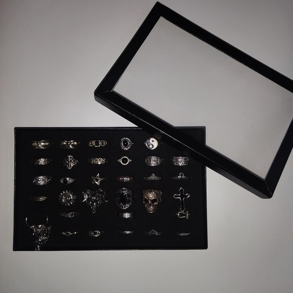 Las áreas para anillos son pequeñas, por lo que mis anillos más grandes no caben bien. Además, el producto llegó abollado.