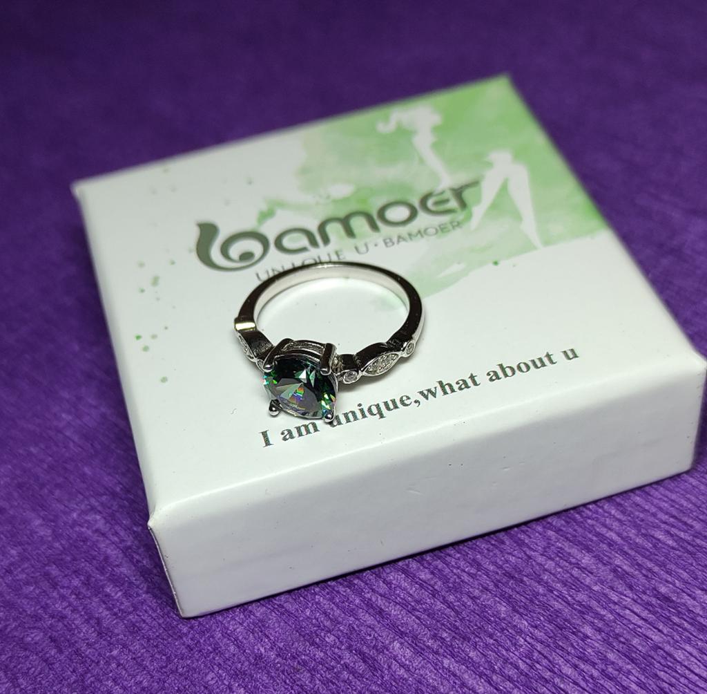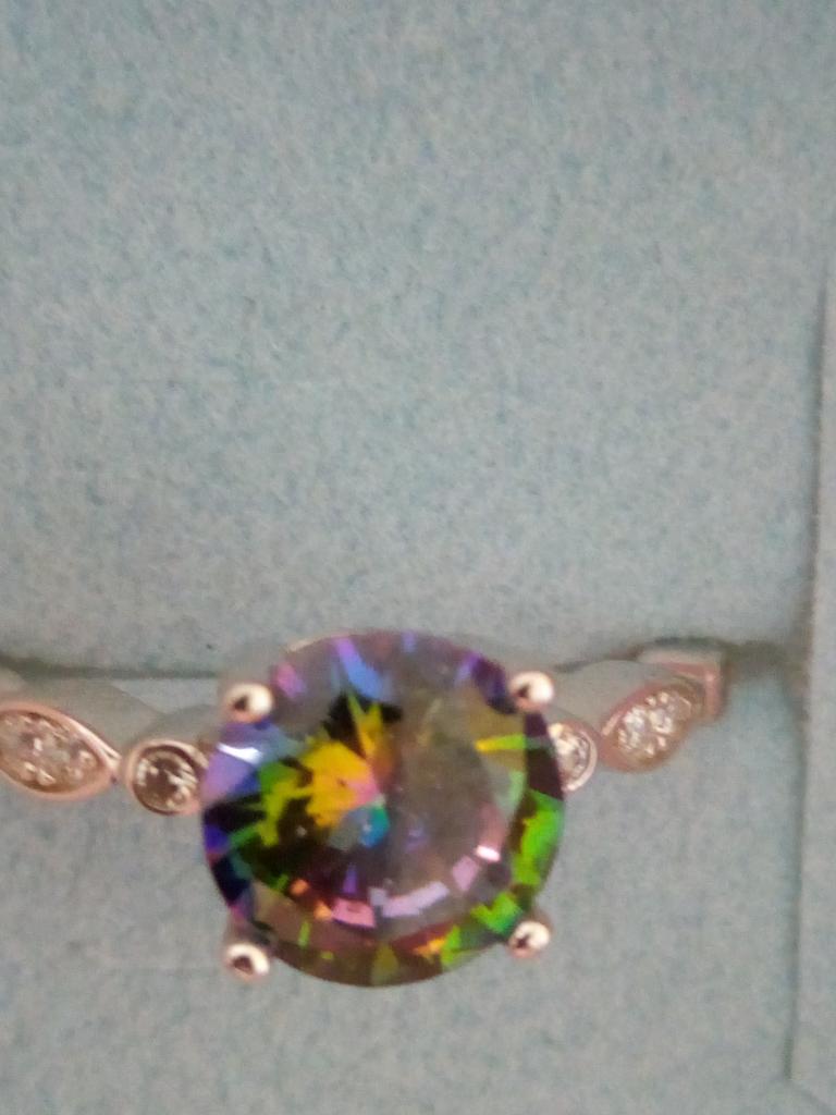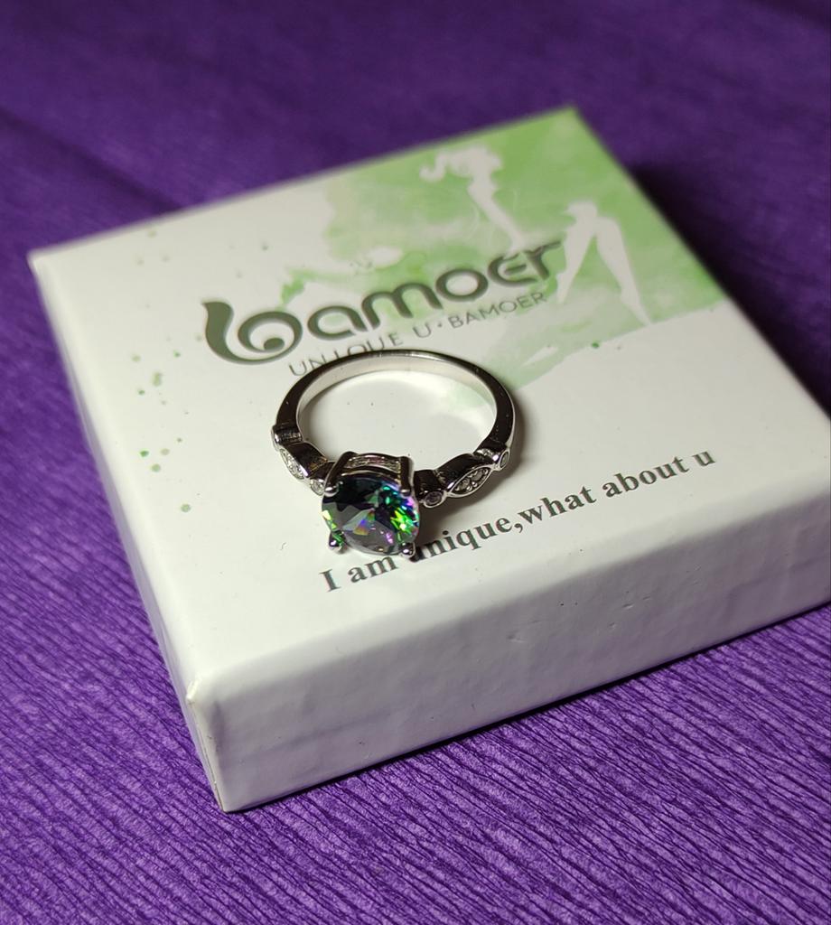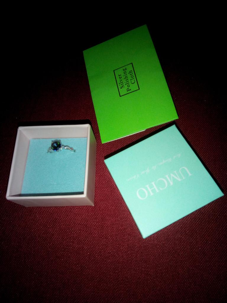 El pedido se entregó en 14 días como paquete de DHL y estaba bien embalado en un sobre de colchón de aire. Además, la mercancía estaba embalada en su propia caja.. Este es un hermoso anillo de plata real de la marca "Umcho", que pedí en una versión con una piedra de color arcoíris. También había azul claro, azul oscuro y verde para elegir.. El anillo está hecho de plata de ley 925 y es de muy alta calidad y detallado. Además de la piedra grande en el medio, hay varios diamantes de imitación blancos más pequeños incrustados en el costado del anillo. El vendedor afirma que las piedras son circonitas artificiales. Así que estoy asumiendo vidrio. En cualquier caso, todas las piedras son muy afiladas y facetadas y reflejan muy bien la luz.. La mano de obra es excelente y no pude encontrar ningún defecto.. Pedí el anillo en una talla 6 y se ajusta perfectamente a mi dedo anular, así que asumo que el tamaño está dentro de las normas.. Estoy muy satisfecho con el producto y el vendedor y me encantaría recomendar ambos. Compraré más de este vendedor en el futuro.