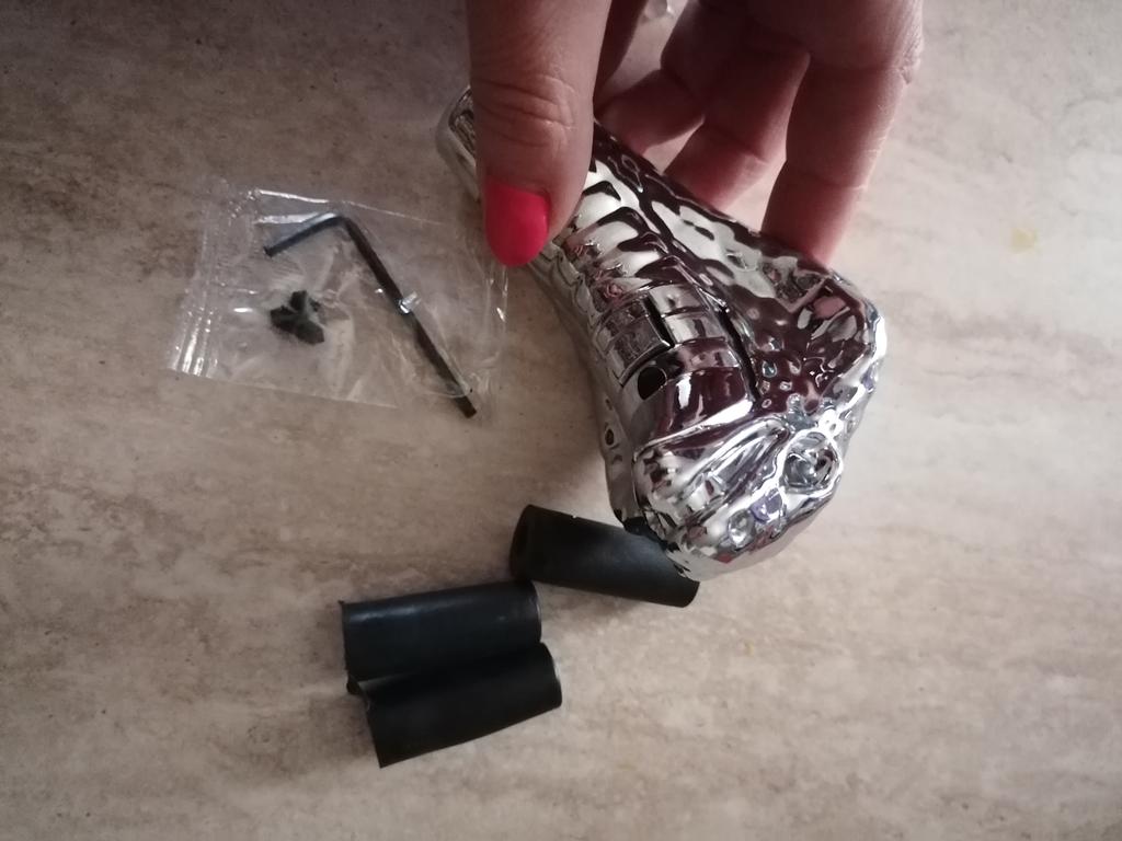 En la imagen, las curvas del cuerpo son más pronunciadas que en la realidad. Hay tres insertos para el diámetro de la palanca del punto de control. sale volando