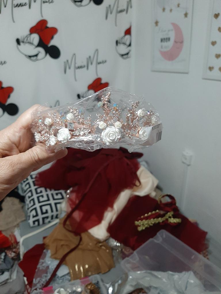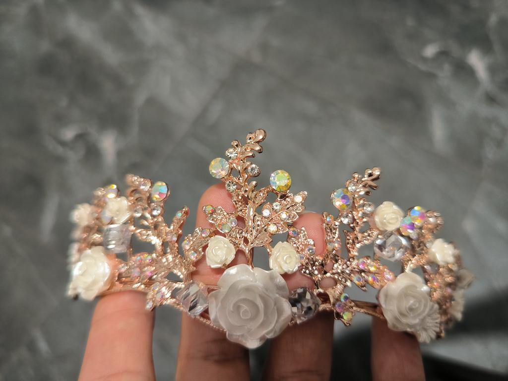 Corona muy bonita, pero lamentablemente se ha roto un trozo de flor y falta una piedra de cristal.