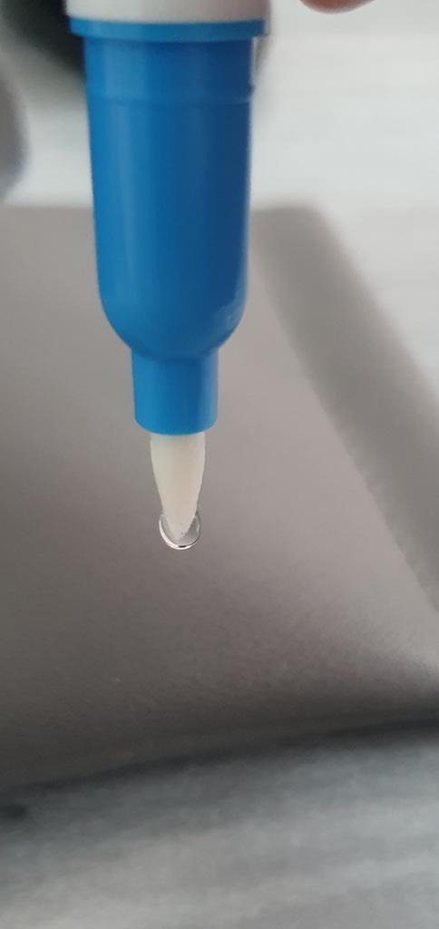 El bolígrafo en el que se pone el agua fluye bastante. La tapa está mojada y también las manos. El libro está bien.