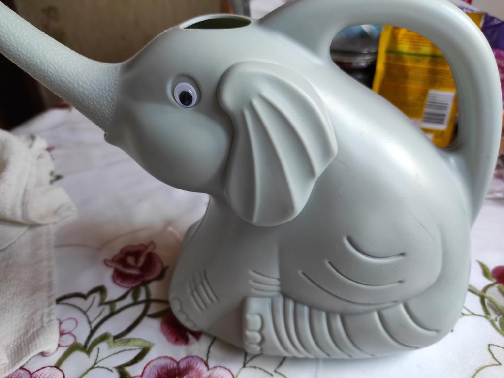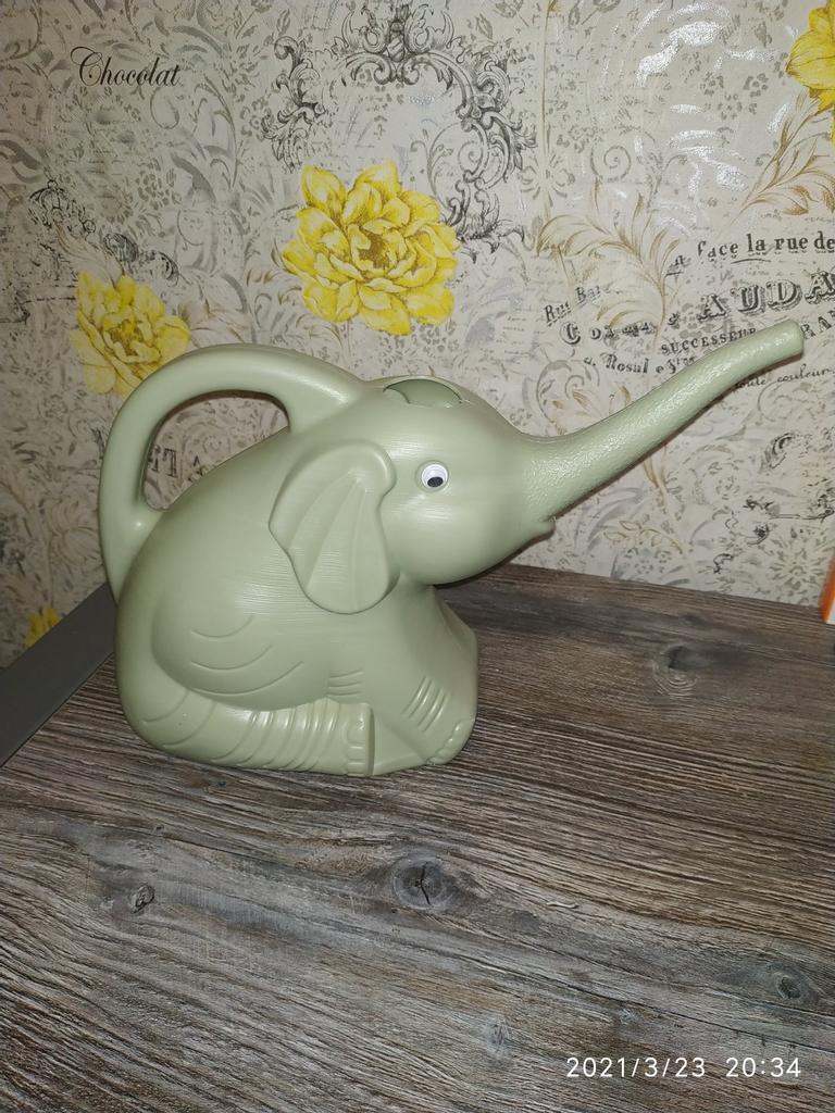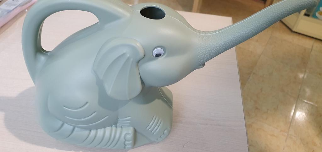 Desafortunadamente, el elefante está abollado, un ojo casi se cae y un pequeño agujero detrás de ti para llenar la regadera, pierdes agua a través del agujero en el costado.
